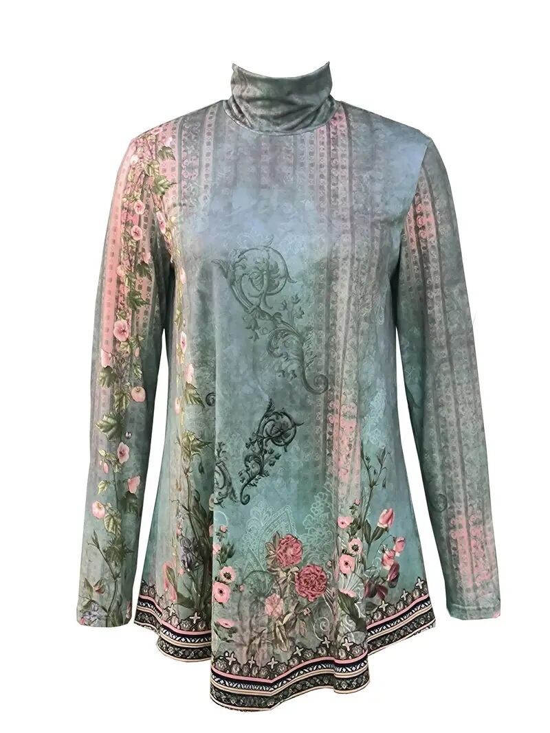 春と秋のシーズンにぴったりのカジュアルな花柄タートルネックTシャツ。女性らしいデザインと快適な着心地を兼ね備えた一枚です。