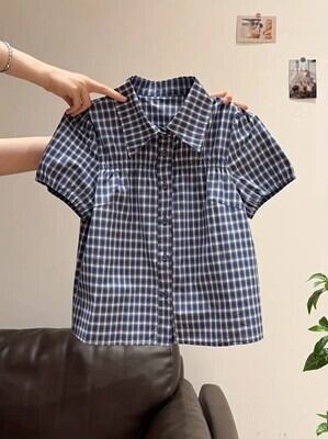 【送料無料】エレガント レディースチェック柄 ポロカラーショートスリーブボタンフレアシャツ シック スタイル カジュアル プレッピー アウトフィット 夏 ファッション AA0160 | monohouse