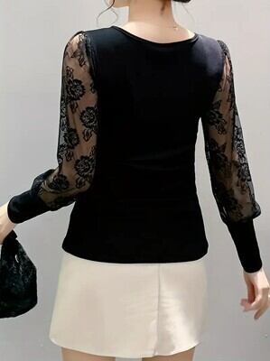 洗練された無地ブルーのブラウスに、ラインストーン装飾が華やかさを添えるエレガントなデザイン。レーストリムと幾何学的フローラルパターンが繊細なアクセントとなり、春夏秋のシーズンにふさわしい一枚です。