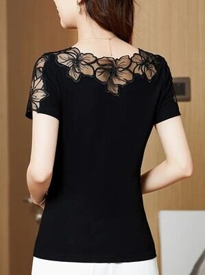 【送料無料】エレガント ストーン装飾付きショートスリーブブラウス 花柄レース デタイル付き 夏 トップ 女性向け カジュアル ドレスアップ多用途の服 花柄 レーストップ 複雑 刺繍 AA0179 | monohouse