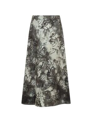 ブラックとグレーのモノトーンに咲く繊細なフラワーパターン。控えめでいて印象的なプリントが、春と秋のコーディネートにさりげない彩りを添えます。ミドル丈の絶妙なバランスと高めのウエストラインが、脚をすっきりと長く魅せ、女性らしいAラインシルエットが自然な品格を演出。