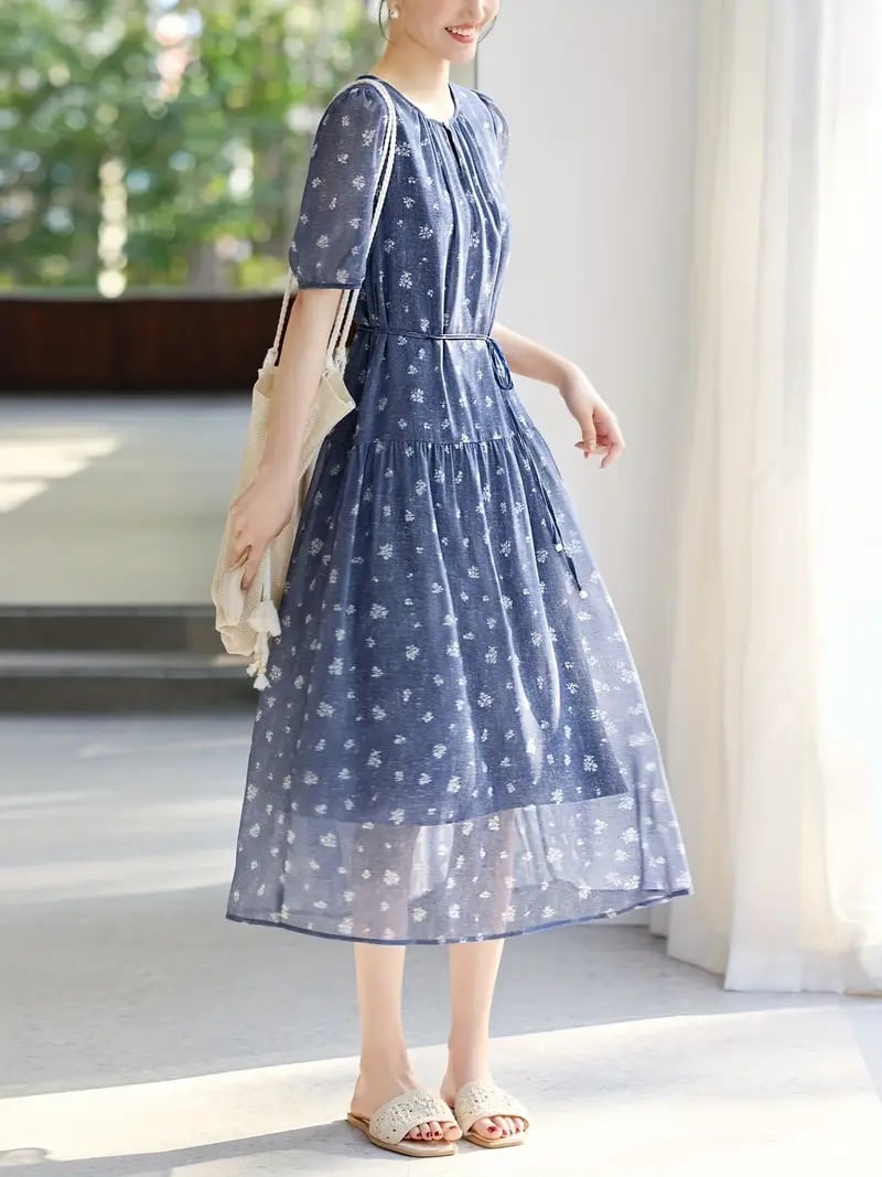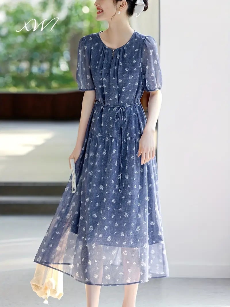 【送料無料】取り外し可能なウエストベルト付きXWIレディースフローラルプリントサマードレス - 軽量で通気性のあるミディHラインシルエット、結婚式・パーティー&バケーション用 - 薄い背景に青い花柄、キュートな夏服、ポルカドット模様 K01196