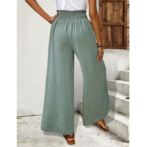 こちらは春夏向けのスプリットヘムワイドレッグパンツで、カジュアルながらも洗練された印象を与えるレディースアイテムです。軽やかな素材感とゆったりとしたシルエットが、快適な着心地を実現。裾にスリットが入っており、足元に抜け感をプラス。ウエストはゴム仕様でフィット感があり、日常使いからお出かけまで幅広く活躍します。シンプルながらもトレンド感のあるデザインで、トップスを選ばずコーディネートしやすい一本です。