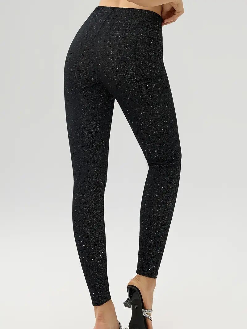 【送料無料】女性用スリムフィットストレッチブラックレギンス、メタライズドファイバー付き - カジュアル&フォーマルウェア向けハイウエストタイトパンツ、オールシーズン快適、エレガントな無地デザイン、滑らかな見た目、シルク質感、マルチボトムス、ソフト素材、おしゃれなスタイル K02392
