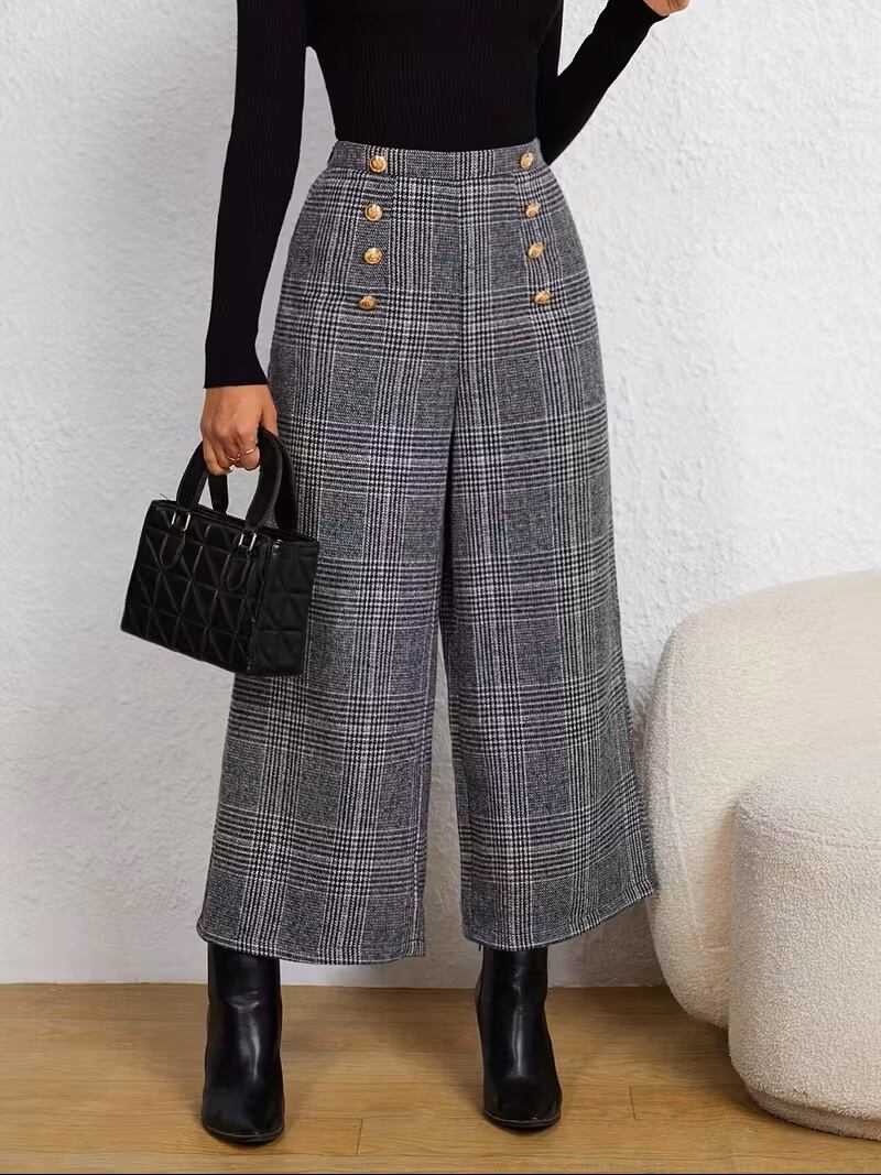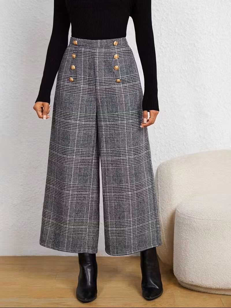 【送料無料】チェック柄プリントワイドレッグパンツ、春夏向けエレガントなボタンハイウエストルーズパンツ、レディース服 K02508