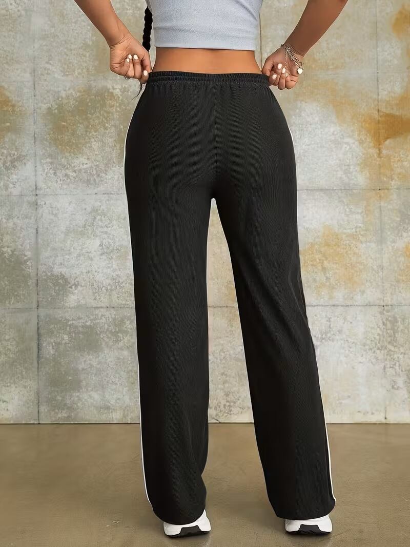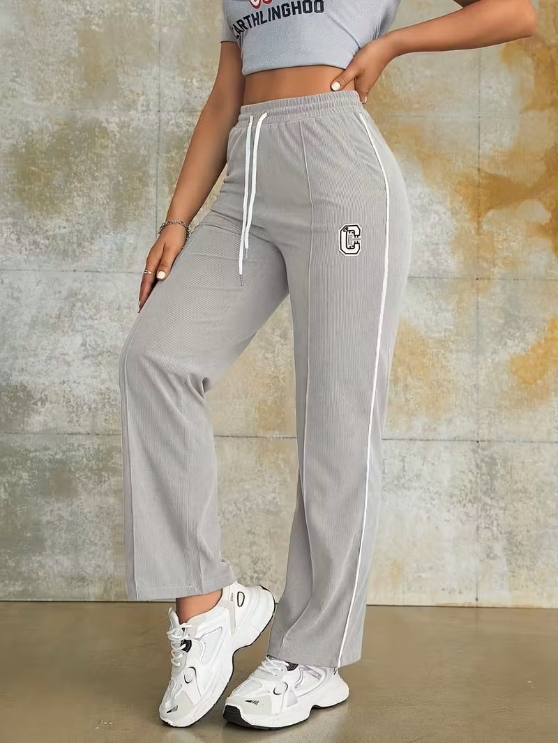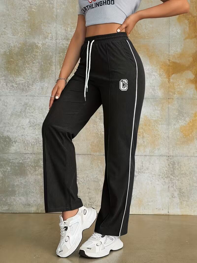 【送料無料】女性のエレガントなハイウエストドローストリングジョガーパンツ、レターサイドポケット付き、無地ポリエステル100%ストレートレッグパンツ、オールシーズン快適、織物、280g/m² - 大人カジュアルウェア K02561