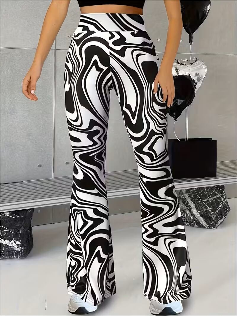 【送料無料】抽象プリントフレアレッグパンツ、春夏用カジュアルハイウエスト禁止パンツ、女性用衣料品 K02583