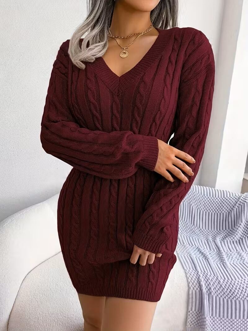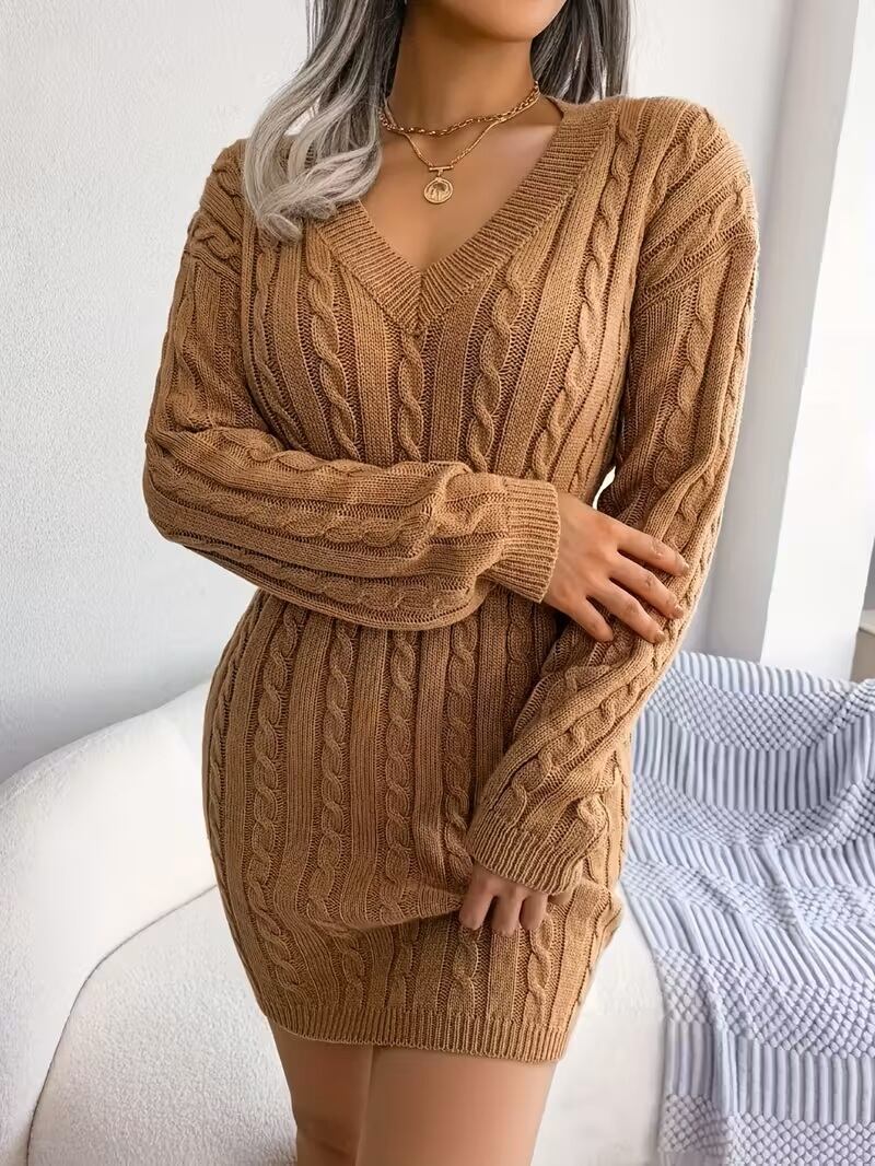 【送料無料】女性の快適なケーブルVネックセータードレス - 長袖、リブテクスチャー、ブラウン、秋と冬に最適、カジュアルからシックなウェア、カジュアルな冬のウェア | Vネックドレス | コンストラクション、セータードレス K02590