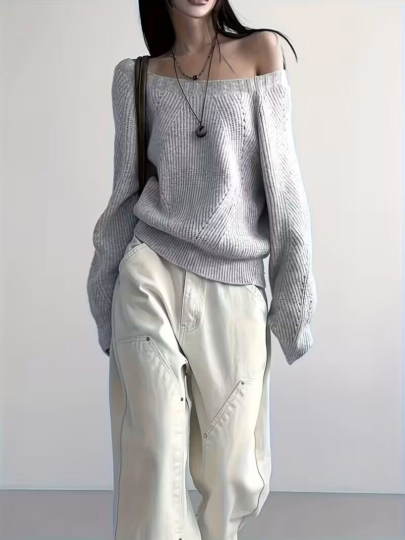 春秋にぴったりのスタイリッシュなレディースオフショルダー/ボートネックセーターコートをご紹介します。このオーバーサイズのジャケットは、韓国風デザインでトレンド感溢れる一着です。