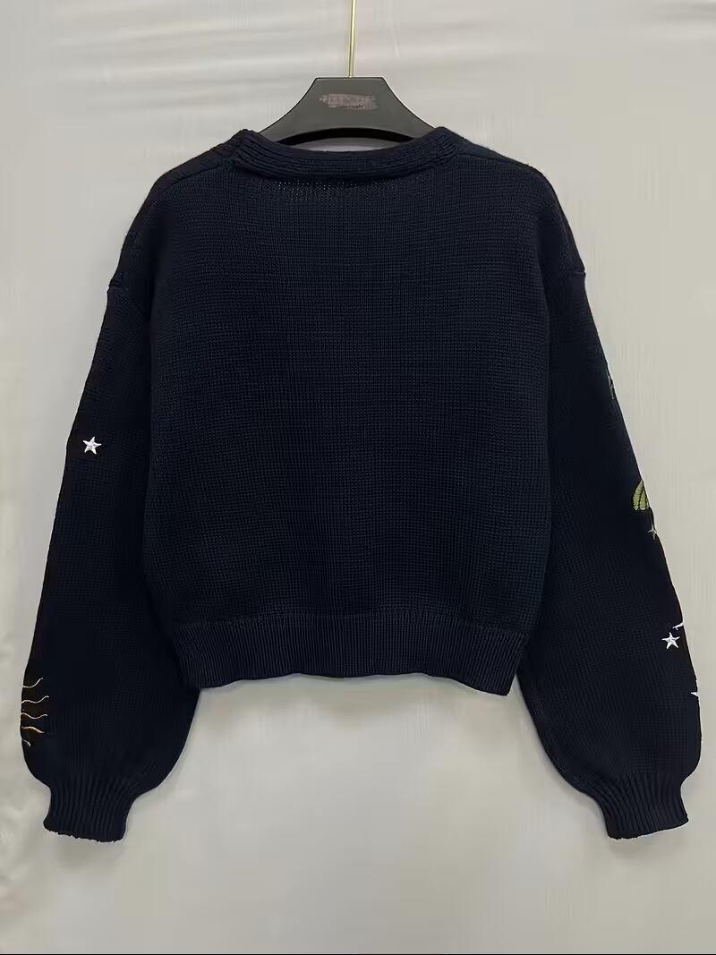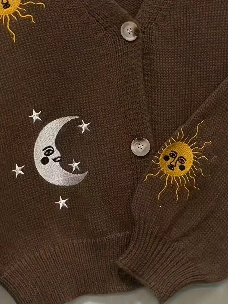 シックなボタンフロントとランタンスリーブが特徴の、太陽と月のパターンが印象的な女性用クロップニットカーディガン。春と秋の季節にぴったりなこのカーディガンは、柔らかなニット素材で仕立てられており、軽やかで快適な着心地を実現。ユニークなデザインがコーディネートに新たな魅力をプラスし、ジーンズやスカート、ワンピースとも好相性です。