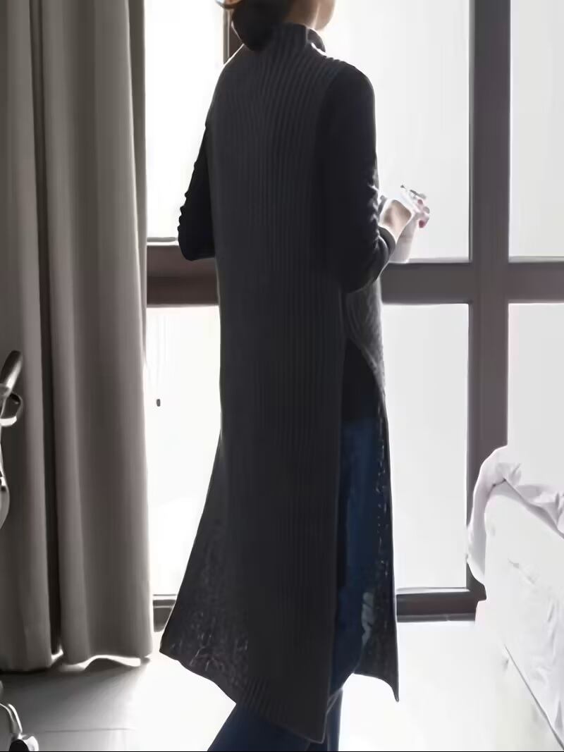 【送料無料】エレガントなグレーのドレス、ハイネック、サイドスリット付き - 長袖、ルーズフィット、秋/冬に最適、多用途のレイヤリングピース、カジュアルなシックスタイル、心地よい衣類 | ハイネックドレス | コンストラクション、セータードレス K02657
