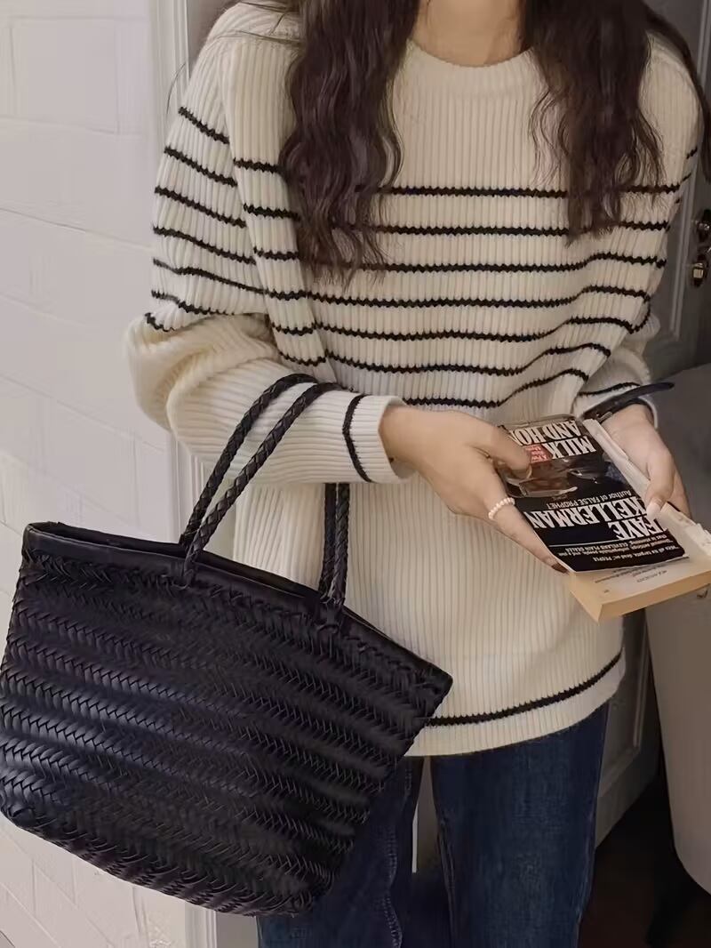 【送料無料】レディース コージーストライプセーター - カラーブロッキングデザインの丸首プルオーバー、洗濯機対応 秋冬カジュアルトップス ソフトテクスチャー 衣類 日本風韓国スタイル K02672