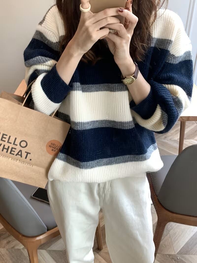 【送料無料】カラーブロッククルーネックセーター、エレガントな長袖セーター、秋と冬のレディースファッション K02716