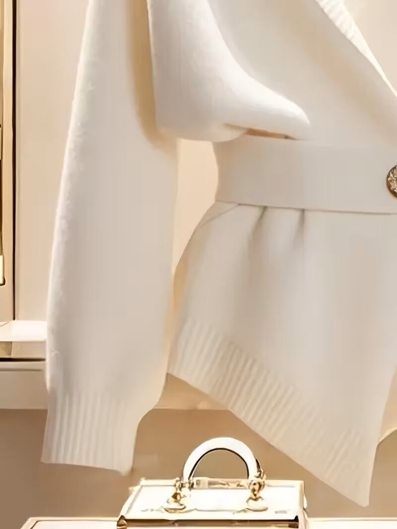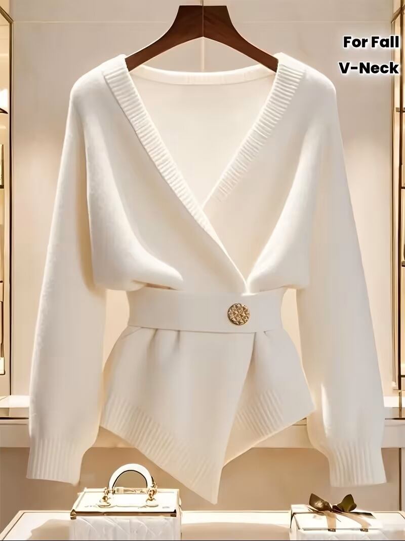 【送料無料】レディース ホワイトVネック 調節可能ベルト付きカーディガン ゴールドバックルディテール - ソフトロングスリーブ エレガントなカジュアルプルオーバー 春秋用 おしゃれな週末着 K02736