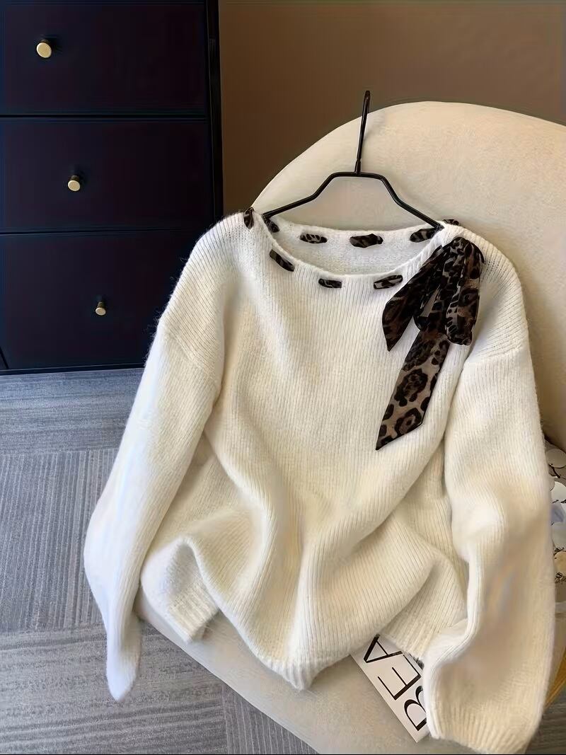 【送料無料】レディース 韓国風 レオパードプリント ボウアクセント セーター - オールシーズン ラウンドネック プルオーバー ホワイトカラー&ボウタイ風 ミディアムストレッチ カジュアルエレガント ブラウス (手洗い/ドライクリーニング) 韓国ファッション セーター K02746 | monohouse