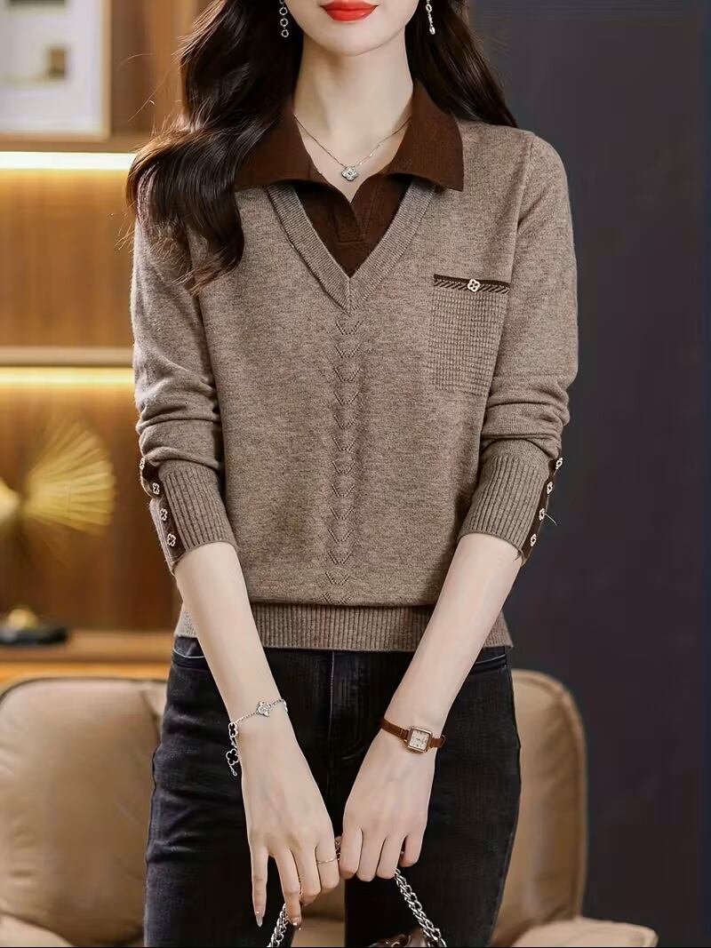 【レディース】エレガントなツートンカラーセーター - & ブラウンカラーブロック、ルーズフィット長袖プルオーバーは、秋冬のコーディネートにぴったりなアイテムです。クラシックな襟デザインとボタンフロントのディテールが、シンプルながらも洗練された印象を与えます。ルーズフィットのシルエットは、リラックスした着心地を提供し、重ね着にも最適です。