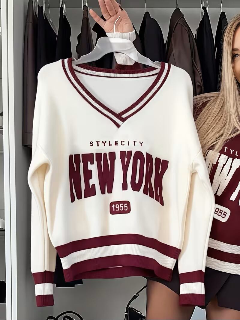 【送料無料】ニューヨーク 1955 年のヴィンテージインスピレーションカラーブロックVネックスウェーター - ルーズフィット、長袖、ミディアムストレッチ、秋/冬ファッショントップ、女性用、カジュアルウェア | ヴィンテージスウェーター | テクスチャ K02769 | monohouse