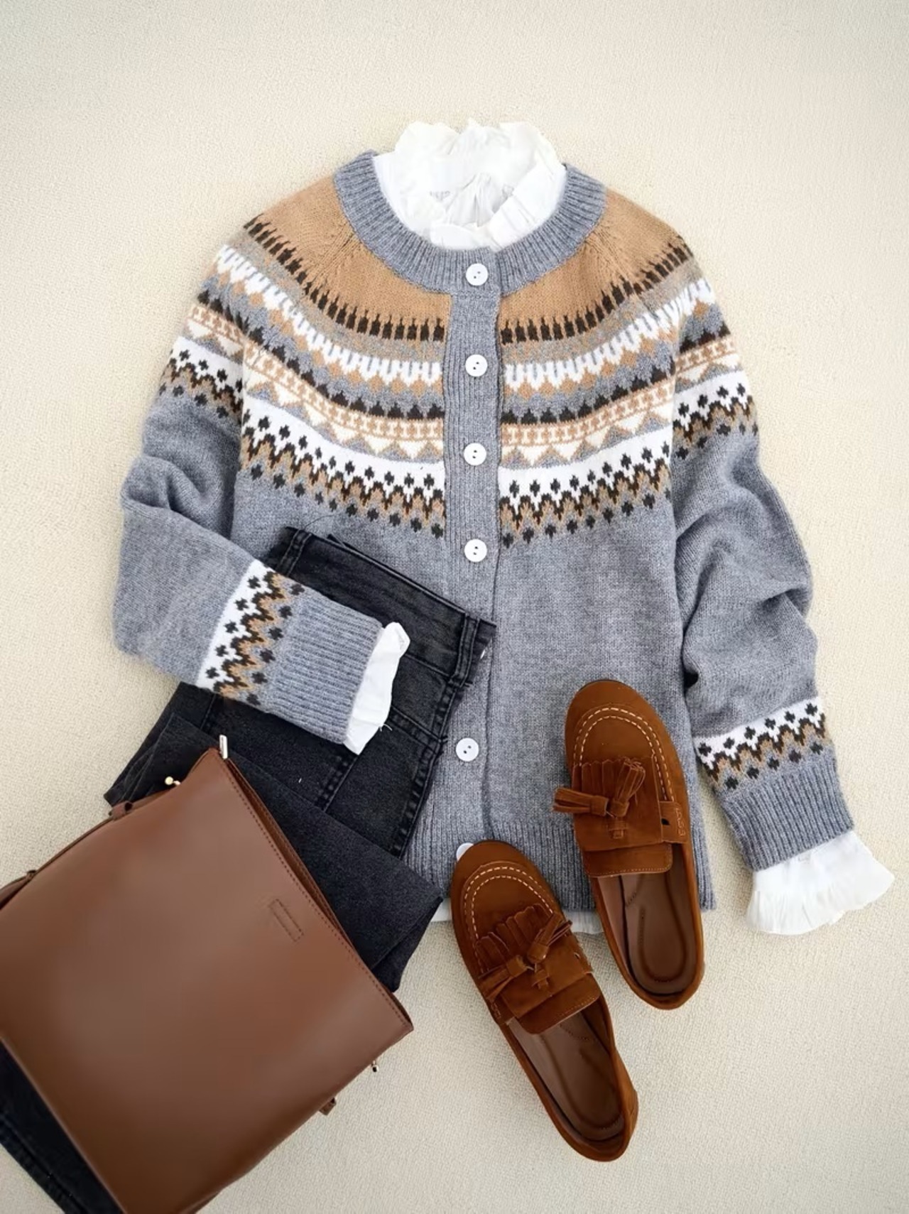レディースセーター - ボタンフロント付きソフト長袖カーディガンが登場!エレガントでありながら、カジュアルなスタイルも楽しめる理想的なアイテムです。秋冬シーズンにぴったりの高品質なニット素材を使用しており、柔らかさと温かさを兼ね備えています。オープンフロントデザインと幾何学模様が特徴的で、日常使いからフォーマルなイベントまで幅広く活躍します。