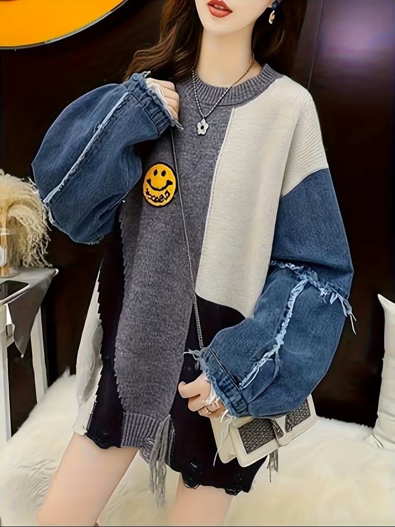 レディース 韓国風 オーバーサイズ ラウンドネック セーターは、冬のファッションに欠かせないアイテムです。デニムパッチワークが施されたデザインは、カジュアルな雰囲気を演出しつつ、ゆったりとしたシルエットがリラックス感をもたらします。洗濯機対応なので、お手入れも簡単。グレー、ベージュ、ホワイト、ネイビーブルーの4色展開で、どんなスタイルにも合わせやすい一着です。