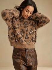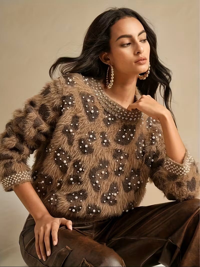【送料無料】レディース カジュアル エレガント レオパードプリント ルーズ プルオーバーセーター ラウンドネック 長袖 ダイヤモンド&バブルビーズ エンベリッシュメント ふわふわ ラグジュアリー ファッショナブル トレンディ シャツ 秋冬向け バケーション デート パーティー などに最適 レディースウェア K02873 | monohouse