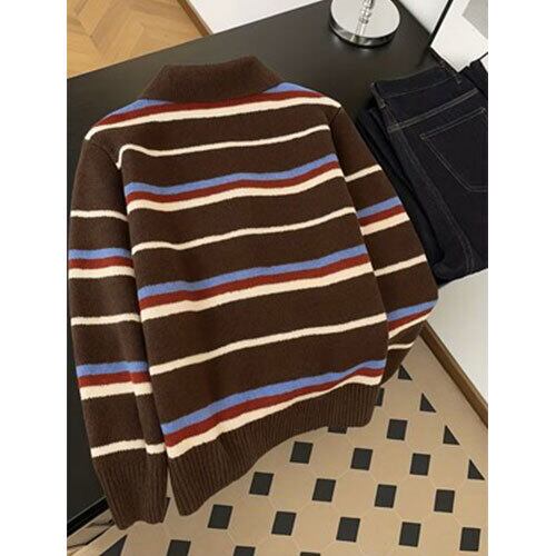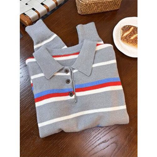 【送料無料】レディース 韓国風 ヴィンテージ ストライプ ボタンフロント カラーセーター - Hライン レギュラーフィット 長袖ブラウス 秋冬用 カジュアル&セミフォーマル 洗濯機対応 (ストライプカラー) K02896 | monohouse