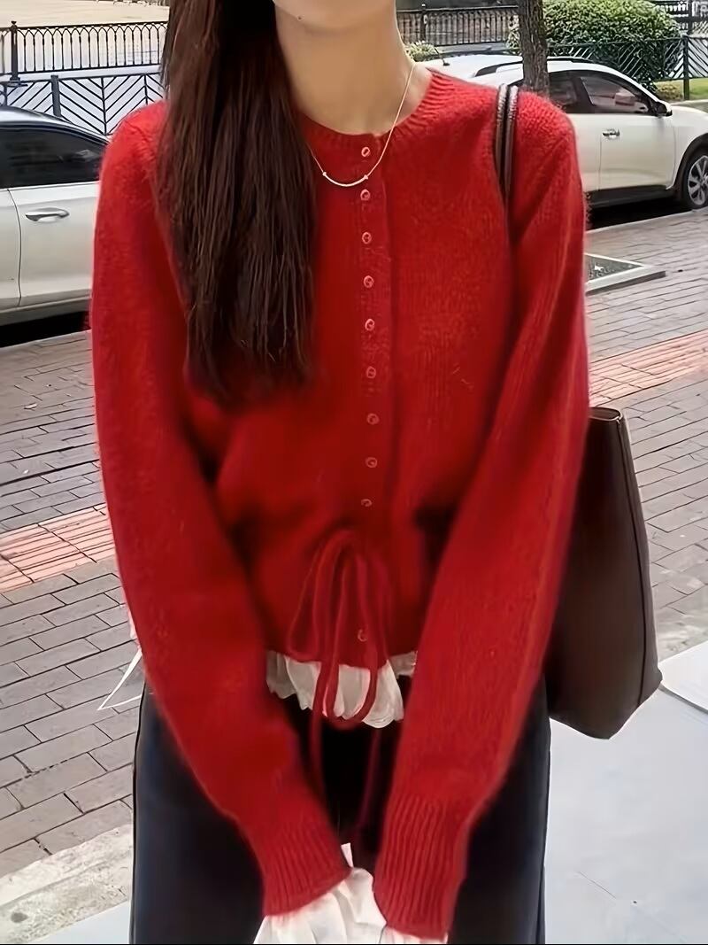 【送料無料】女性用レッドレーストリム・フローラルペタルスリーブ&ボウディテールのカーディガン - 中東風エレガントなオープンフロントセーター、全シーズン着用可能、クラシックなレディースセーター、おしゃれなレイヤリング、フェミニンスタイル、繊細なレーストリム K02892 | monohouse