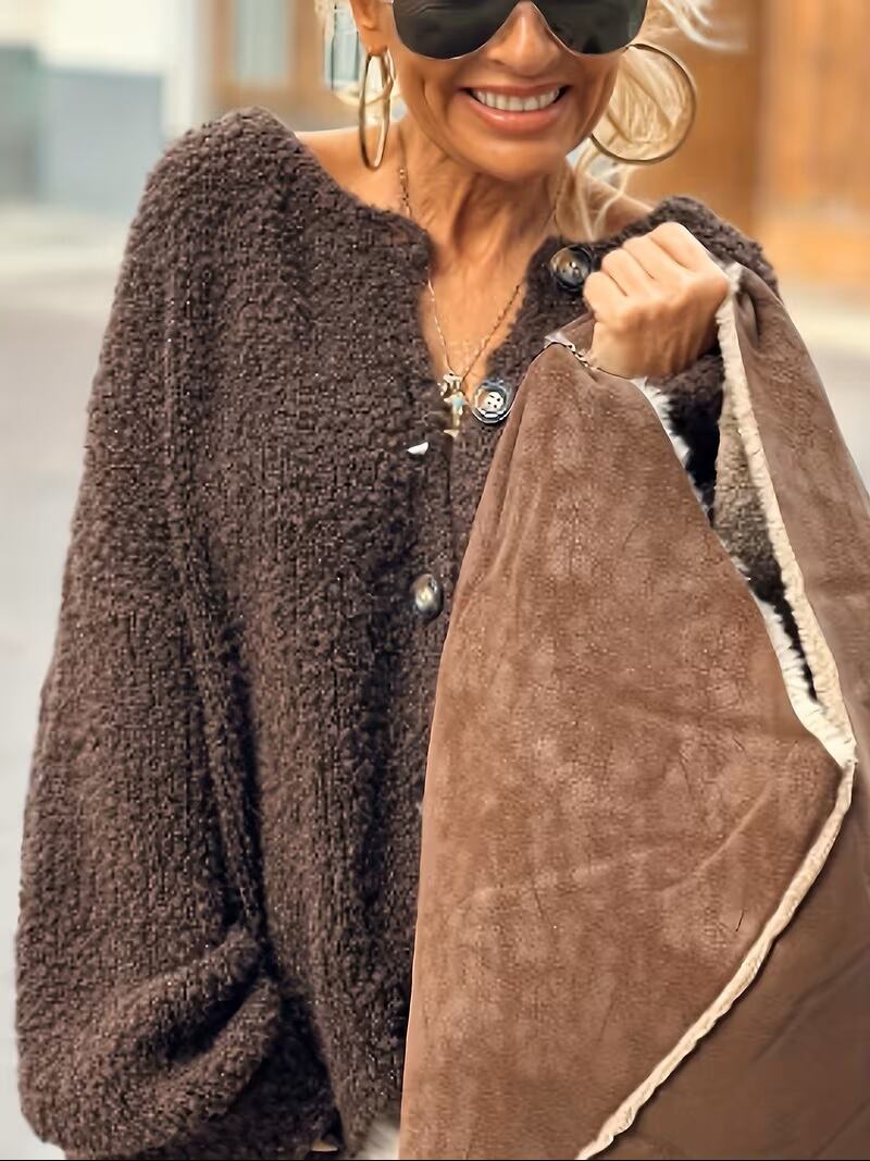 こちらは、エレガントな無地ブラウンセーターコートです!柔らかなソフトラウンドネックデザインと長袖で、寒い季節でも快適に過ごせます。ボタン前開きのスタイルは、カジュアルからフォーマルなシーンまで幅広く活躍すること間違いなし。オールシーズン着回しが効くトレンドのあるアイテムなので、日常使いはもちろん、ビジネスやパーティーにもぴったりです。