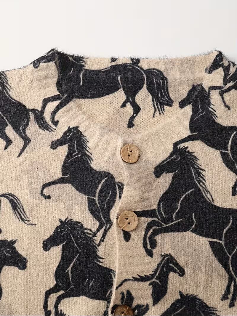 【送料無料】レディース ホースプリント カーディガンセーター - エレガントなルーズフィット 長袖 ホーステーマジャケット ブラック&ホースパターン オールシーズン セーターコート イベント・カジュアル・ドレッシーウェア用 (洗濯機可) K02907 | monohouse