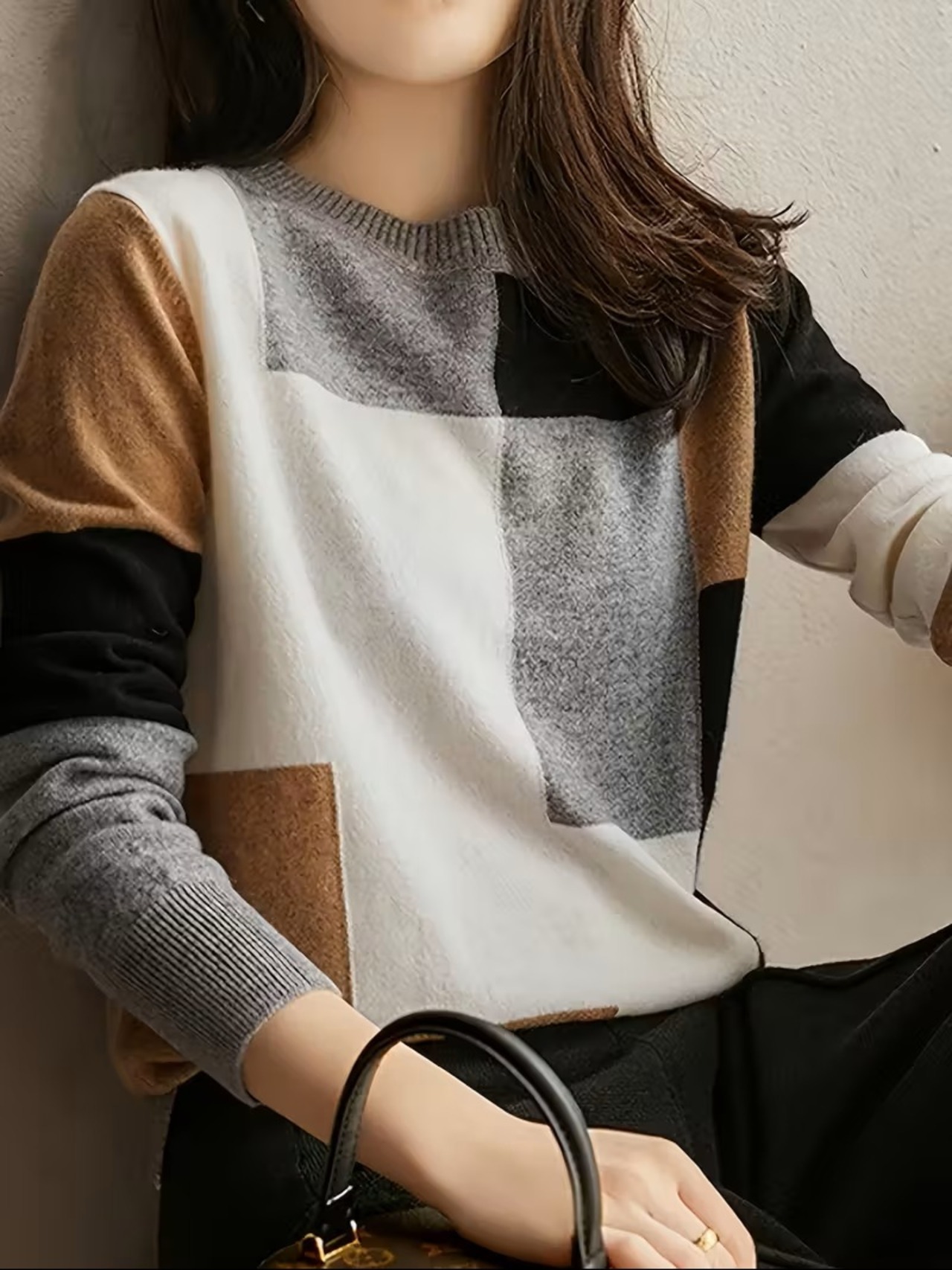こちらは、エレガントなカラーブロックデザインが魅力的なクルーネックセーターです!長袖のルーズフィットスタイルが特徴で、カジュアルなシーンはもちろん、様々なコーディネートに取り入れやすいアイテムです。快適な着心地を実現するわずかにストレッチの効いた素材を使用しており、動きやすさも抜群です。秋冬の必需品として、おしゃれなレイヤリングにも最適です。季節感を演出し、スタイリッシュな印象を与えてくれる一着です!