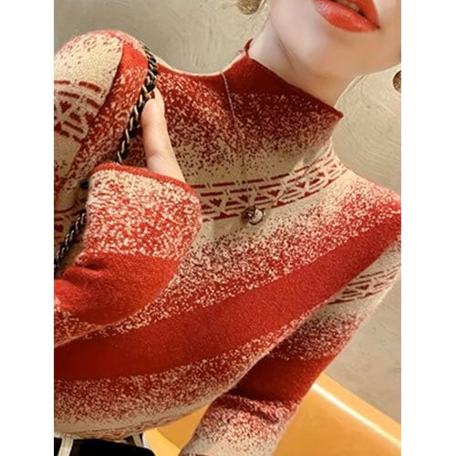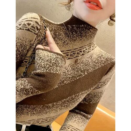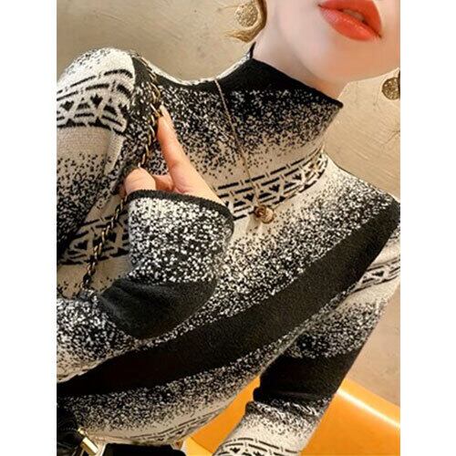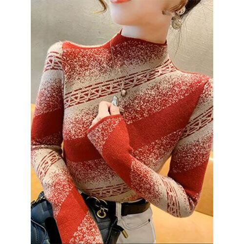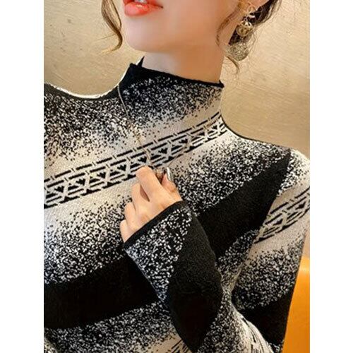 ストライプ柄が目を引くモックネックのプルオーバーセーターです。シンプルながらも洗練されたデザインで、1枚でコーディネートの主役になるアイテム。袖口にはインナーを重ね着したようなレイヤード風デザインを採用し、こなれ感のあるスタイルを演出します。柔らかく伸縮性のある素材で着心地が良く、デイリー使いに最適。モックネックが首元をすっきり見せつつ、程よい暖かさをキープします。
