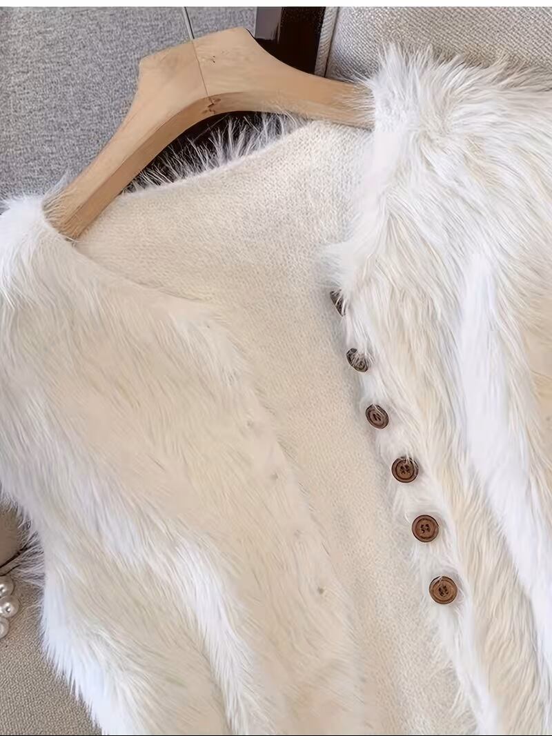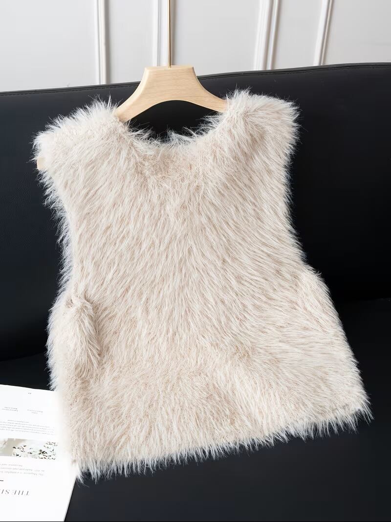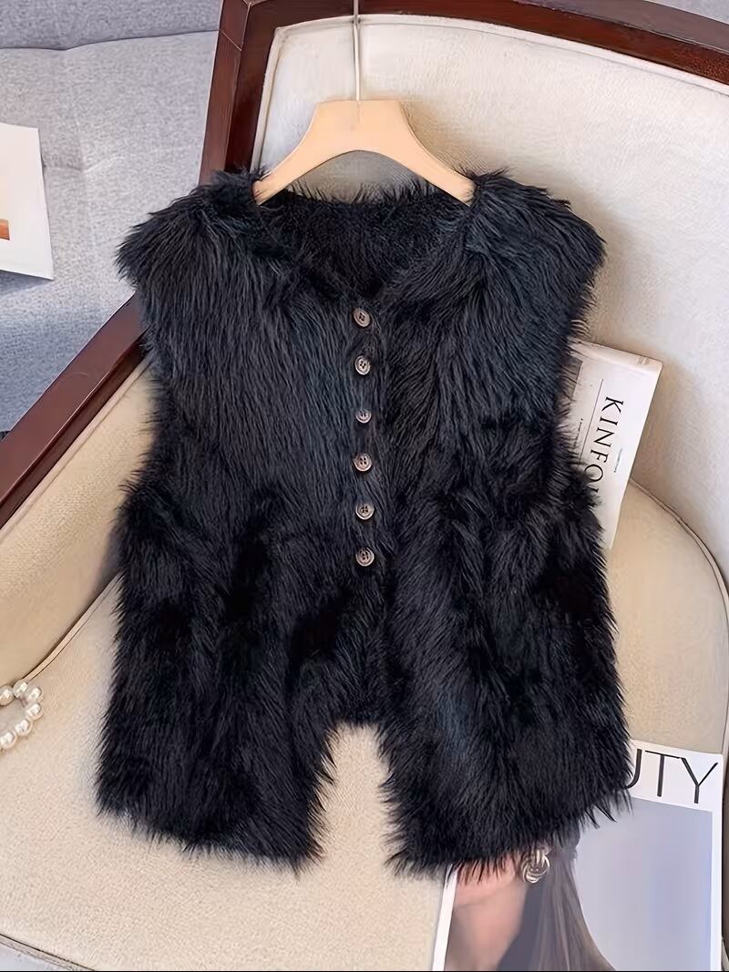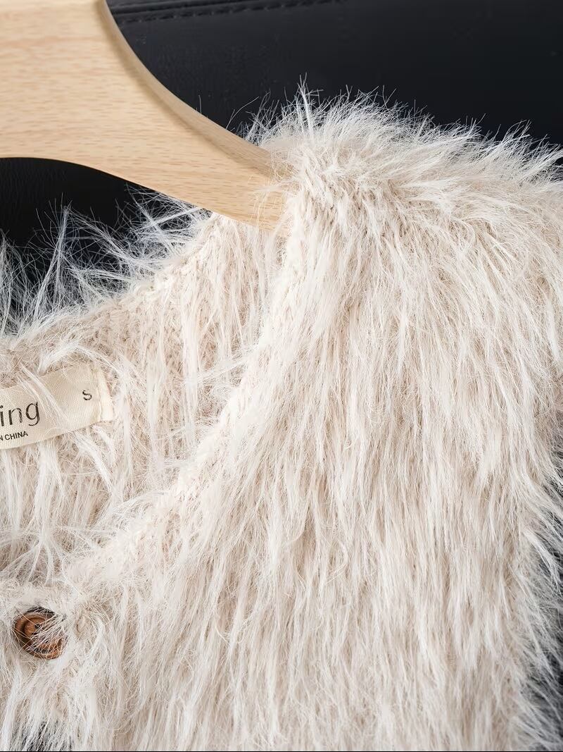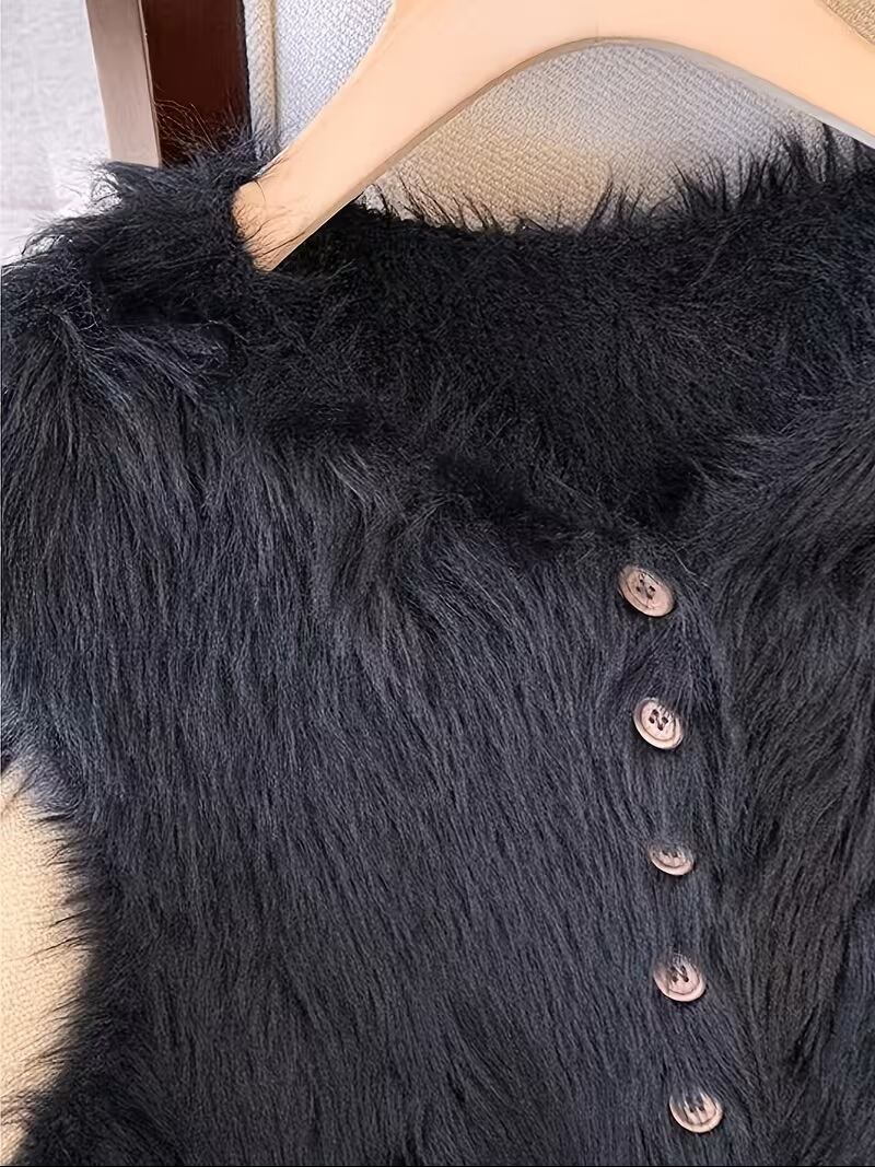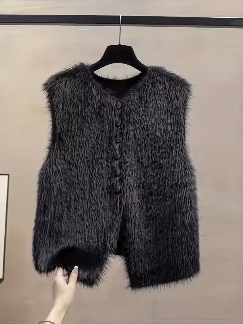 【送料無料】女性用エレガントなフレンチインスパイアードフェイクミンクノースリーブカーディガンベスト - 厚手の冬暖かさ、ラウンドネックボタンフロントクロージャー、Hラインシルエット、無地カラー多機能アウター、秋冬向け、カジュアルからセミフォーマルまで(中国製)、女性用エレガントベスト、ふわふわベスト、女性用ベスト K02935 | monohouse