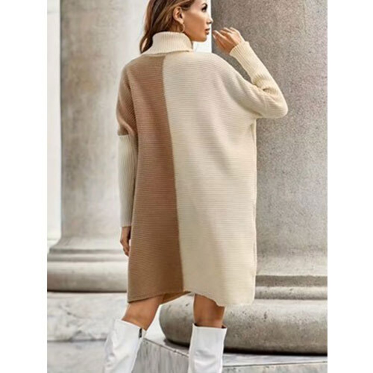 【送料無料】女性のシックなツートン高首ドレス - ビーズとホワイトのカラーブロック、長袖、秋/冬カジュアルスタイル、ブレンド、洗濯機洗い可能、カジュアル冬用 | シックなツートンドレス | コンストラクション、セータードレス K02950 | monohouse