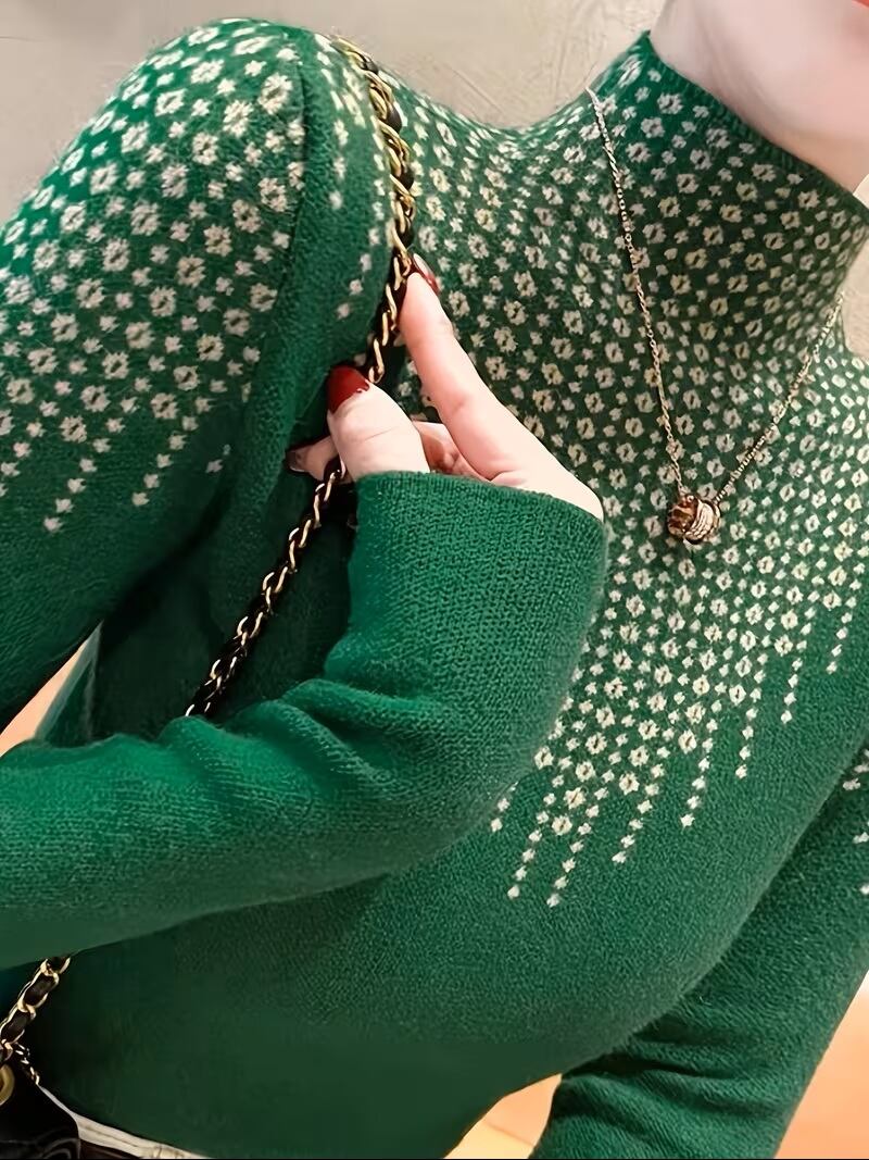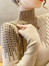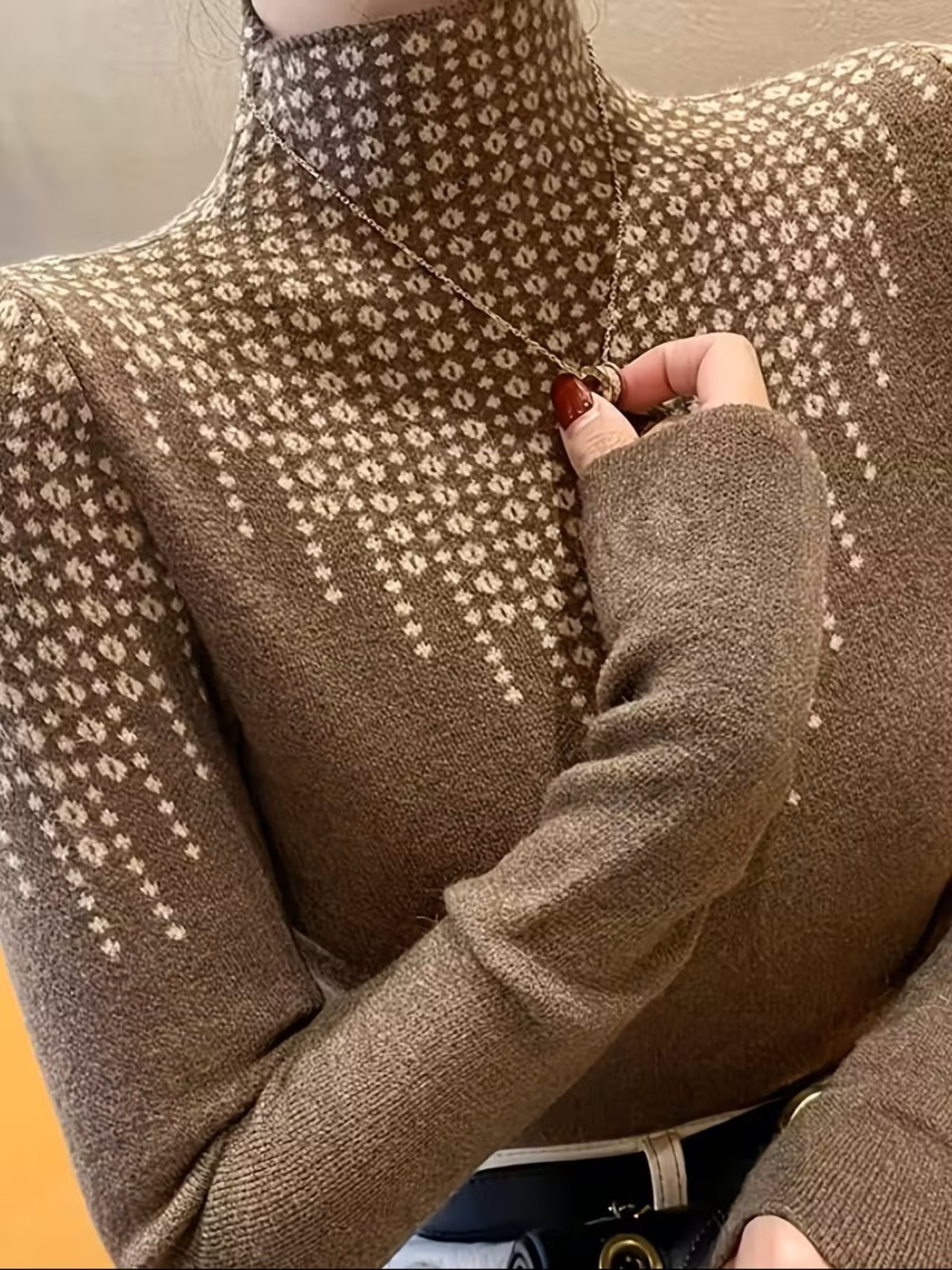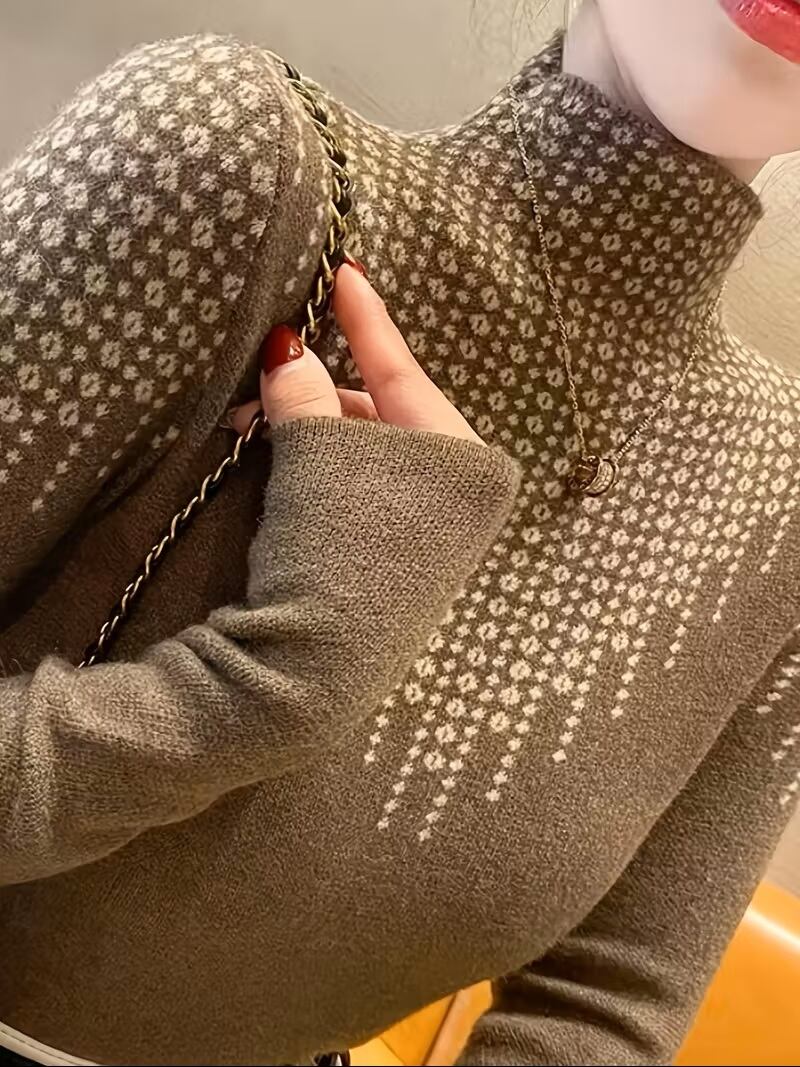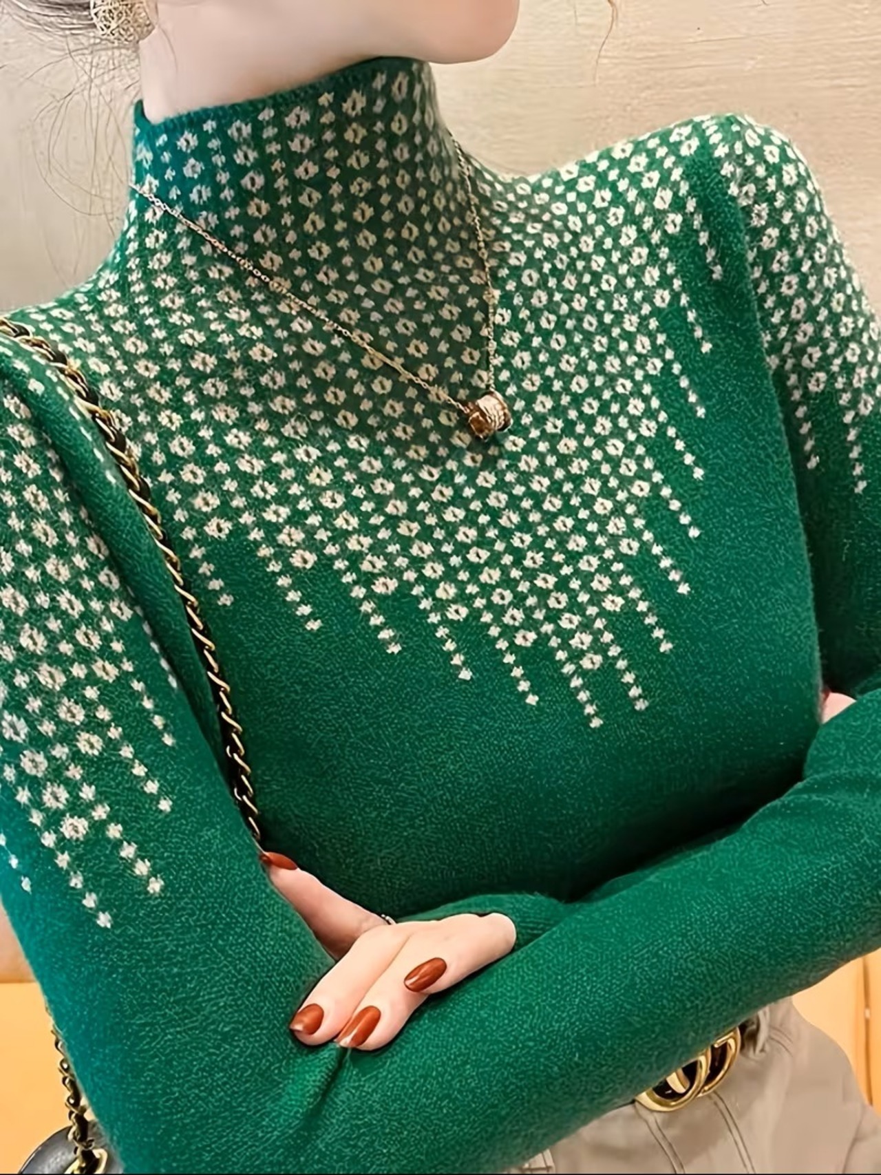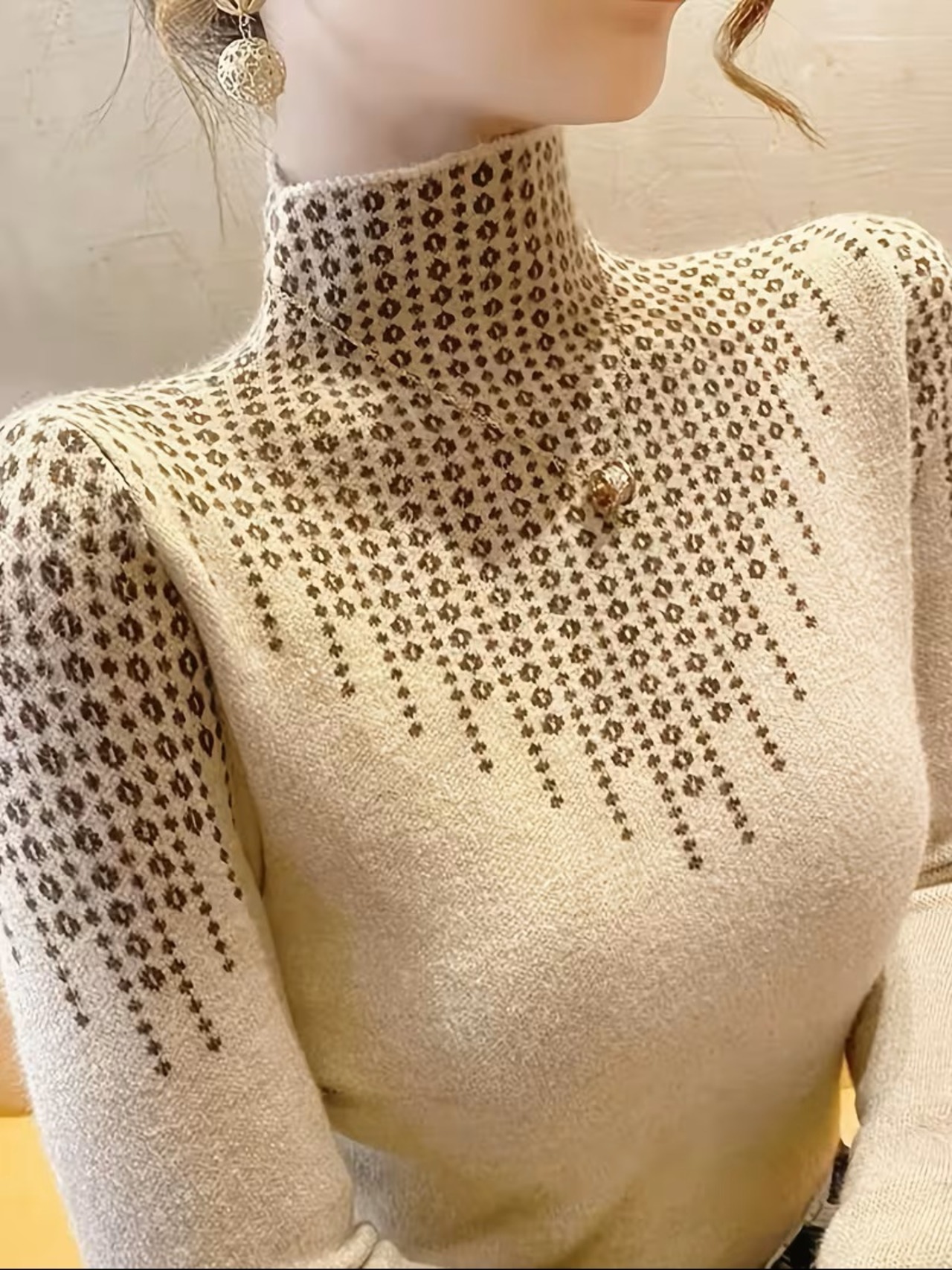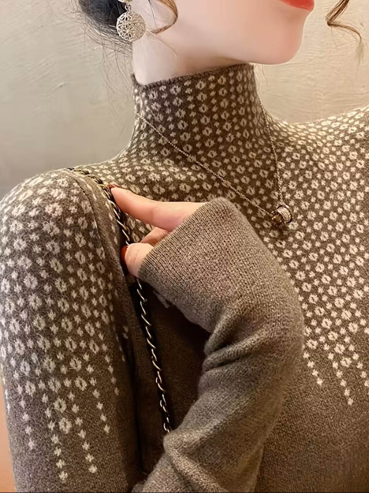エレガントな雰囲気を演出する、レディースのジオパターンタートルネックプルオーバーセーターです。心地よい伸縮性のある素材を使用しており、身体にフィットしながらも動きやすい設計。美しいジオメトリックデザインが魅力的で、シンプルなコーディネートに加えるだけで洗練された印象を与えます。長袖仕様で、寒い季節でも暖かく、さまざまなスタイルに合わせやすい万能アイテムです。