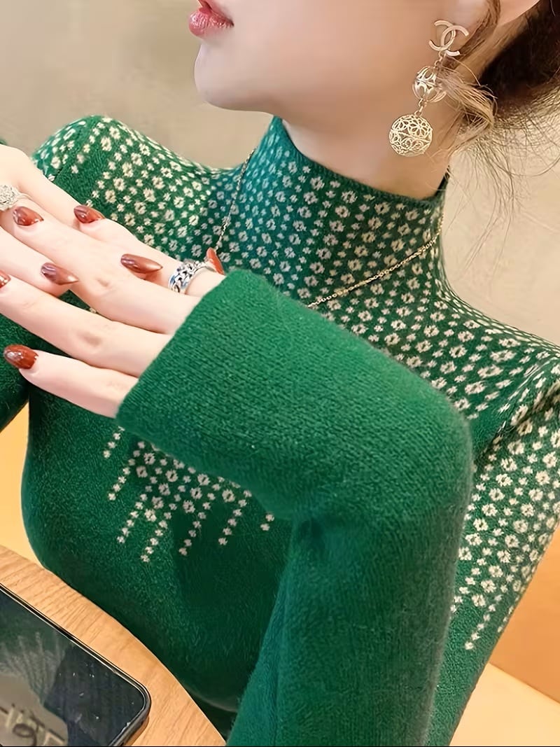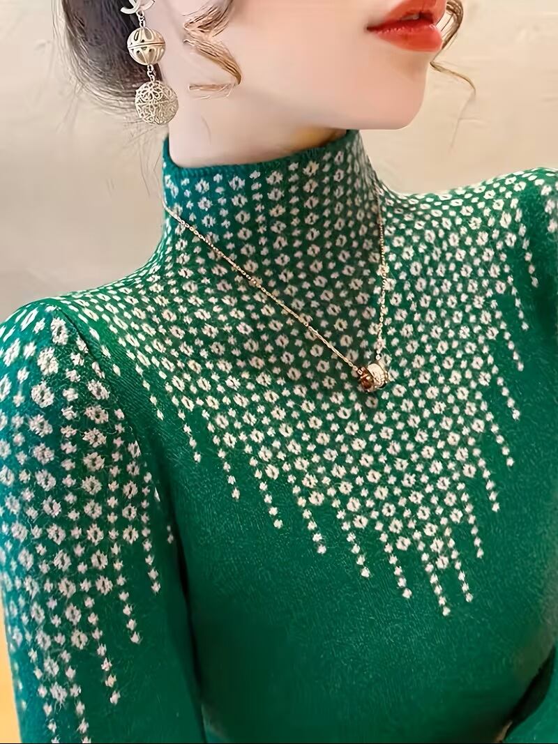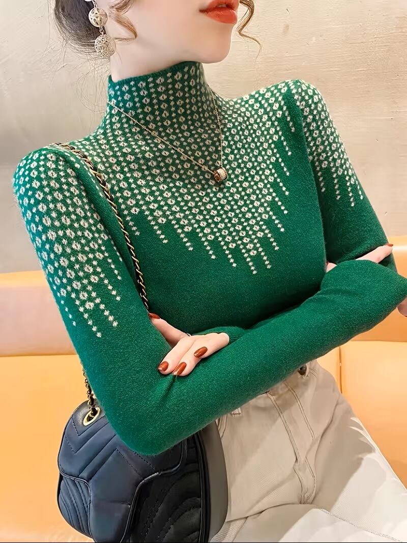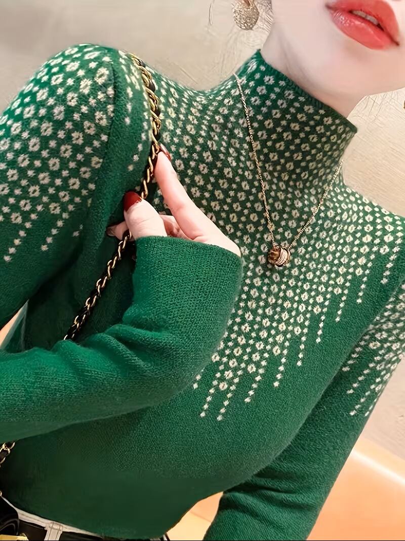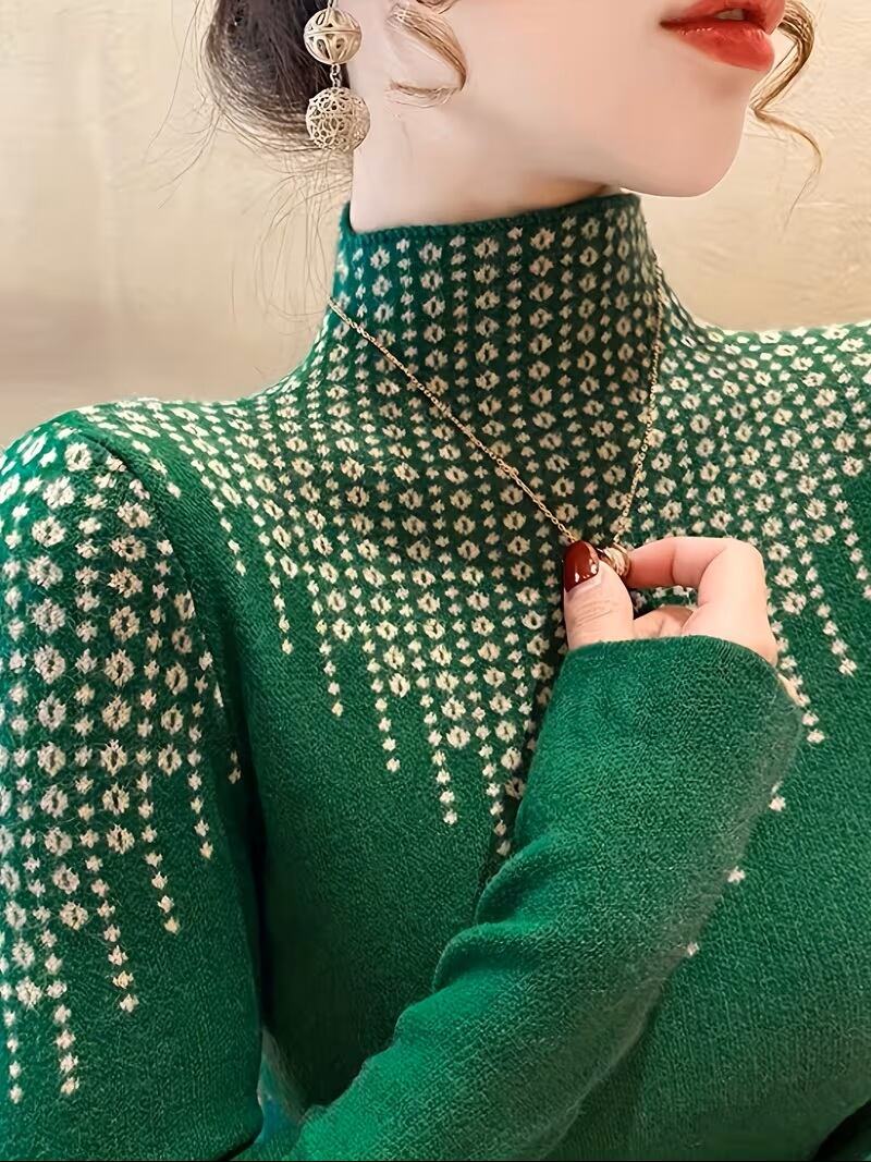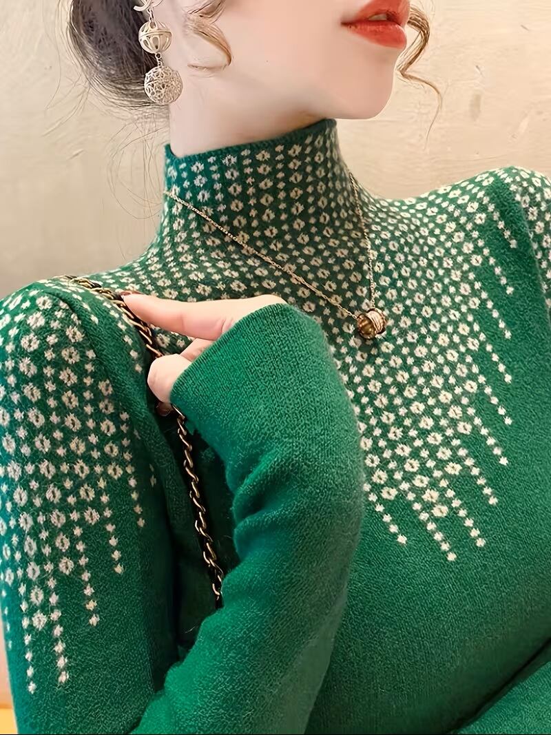 寒い季節に欠かせない、レディースエレガントスリムフィットタートルネックセーターです。厚手の素材を使用し、しっかりとした暖かさを保ちながらも身体に優しくフィットするデザインが特徴です。鮮やかなグリーンの幾何学模様に襟&袖のトリムが加わり、シンプルながらもスタイリッシュな印象に仕上がっています。オールシーズンでのレイヤリングやカジュアルなコーディネートに最適で、プルオーバータイプのため着脱も簡単です。