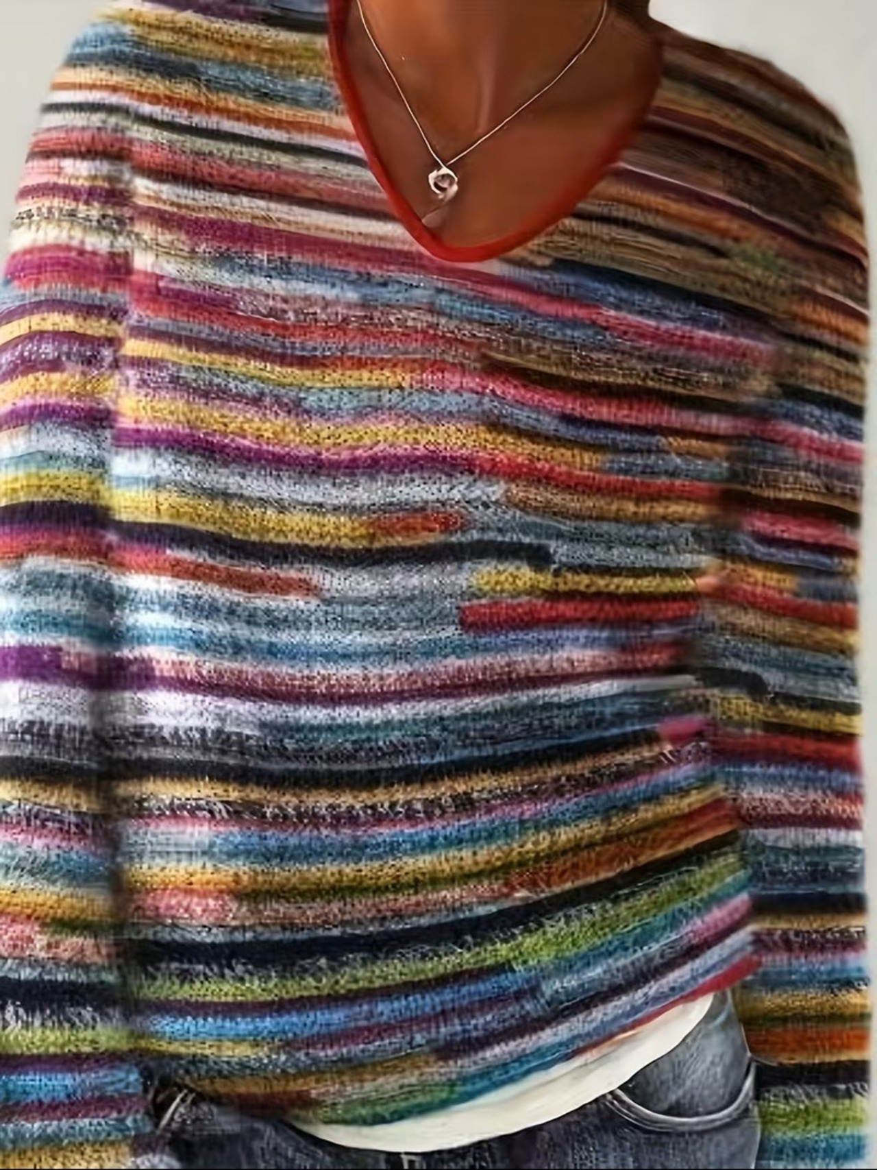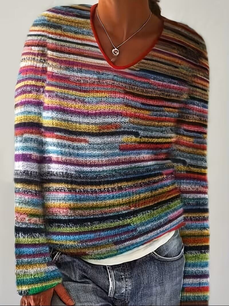 洗練されたスタイルを演出する、レディースエレガントカラーブロックセーターのご紹介です。Vネックデザインとストライプ柄が特徴的で、カジュアルからフォーマルまで様々なシーンに対応可能。高品質なステッチで作られたこのプルオーバーは、柔らかい素材感が心地よく、一日中快適に着用できます。トレンドに敏感なファッション愛好家にもぴったりなアイテムです。秋冬のワードローブに欠かせない、スタイリッシュなレイヤリングピースとして活躍します。