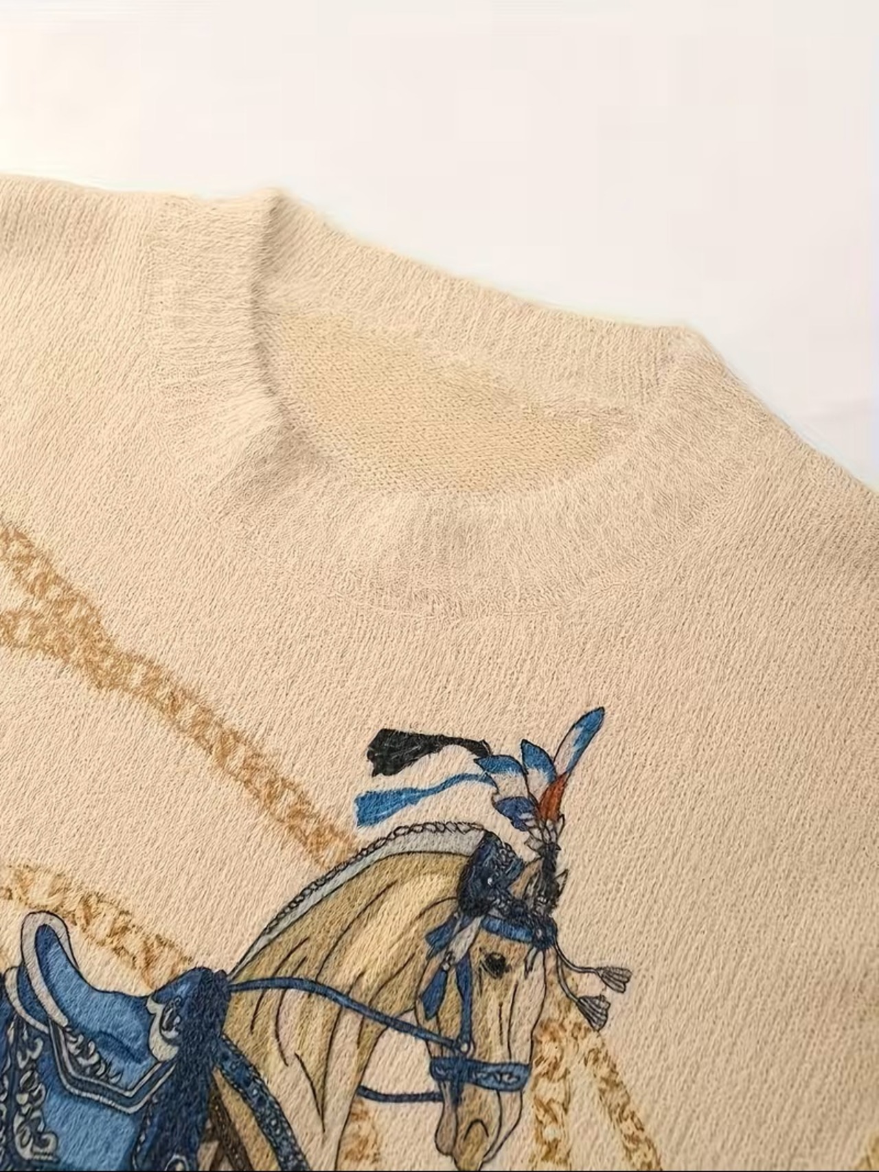 【送料無料】【ヴィンテージ風】馬柄 クルーネック セーター | レディース ルーズで心地よいプルオーバー、スタイリッシュでアーティスティックなオールシーズン対応の服装 K02987 | monohouse