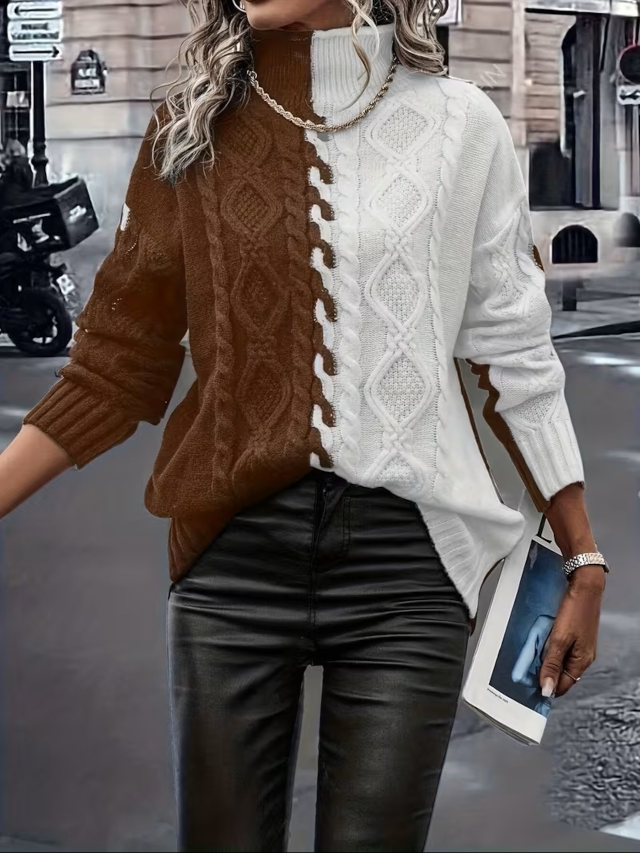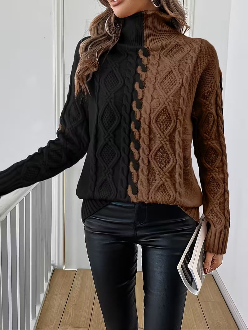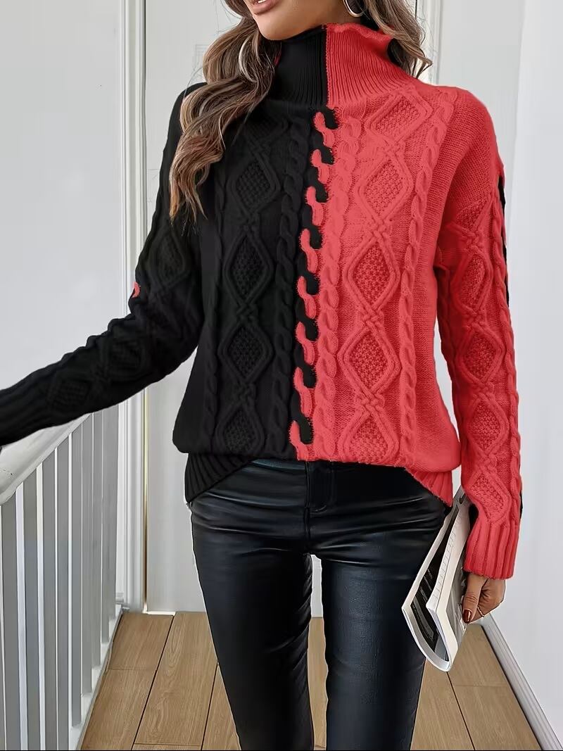 エレガントなハイネックブラウスが登場!縦ストライプとカラーブロックデザインが特徴的で、オフィスからセミフォーマルな場面まで幅広くご活用いただけます。柔らかいストレッチ素材と長袖仕様で、冬の暖かさを保ちながらもスタイリッシュに装えます。シンプルながらもコーディネートの幅を広げてくれるこの一着は、秋冬のレイヤリングに最適です!
