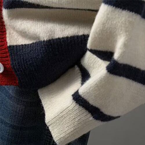 軽量で快適な着心地が魅力のレディース長袖カーディガンです。ベージュを基調とした柔らかな色合いに、レッドのストライプがアクセントとなり、シンプルながらも洗練されたデザインに仕上がっています。フロントはボタンアップ仕様で、気温に合わせて開閉しやすく、秋冬のレイヤードスタイルに最適。薄手ながら暖かく、デイリー使いからオフィスカジュアルまで幅広く活躍します。