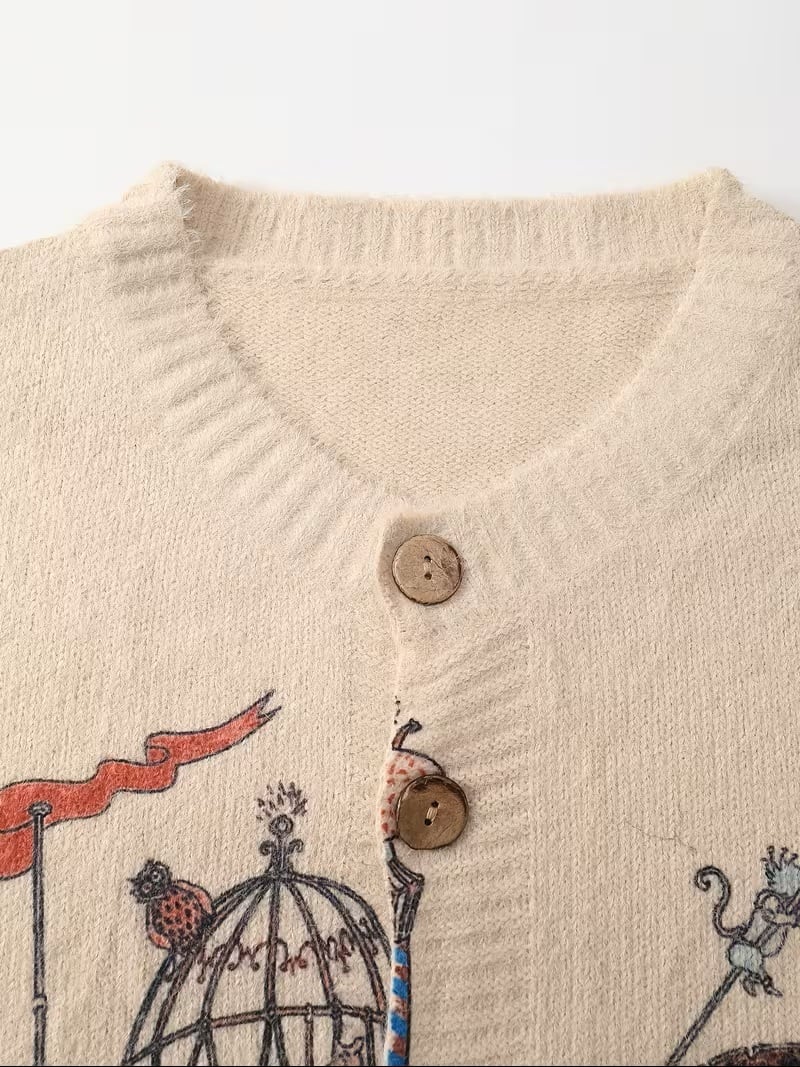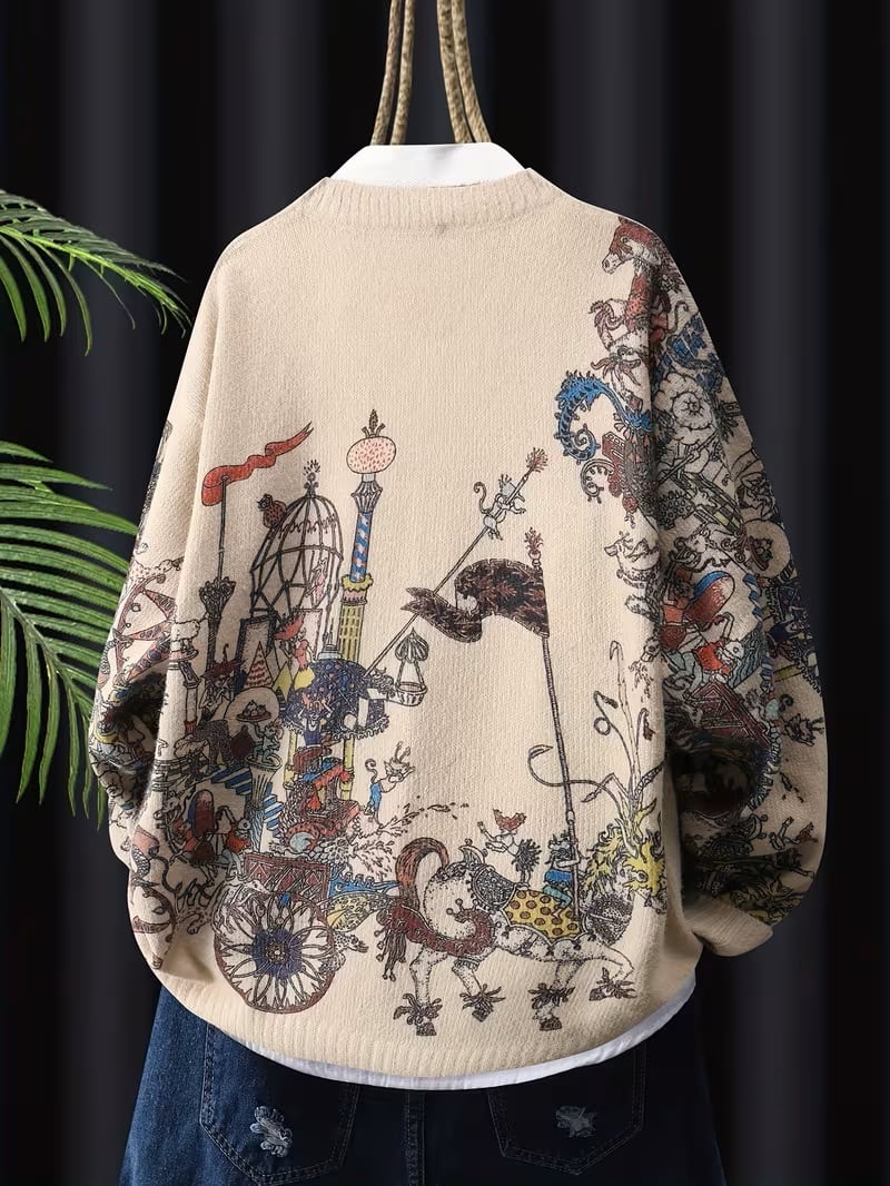 ファッション性と快適さを兼ね備えた、ウェスタンヴィンテージマーケットキャリッジ柄、サーカスパフォーマンス柄のボタンカーディガンが新登場です!大胆でユニークなデザインは、あなたの個性を引き立て、カジュアルな日常のスタイルにアクセントを加えてくれます。オープンフロントの長袖トップは、さまざまなコーディネートに合わせやすく、季節を問わず活躍するアイテムです。柔らかい素材感が心地よさを提供し、一日中着ていてもストレスフリーな着心地です。