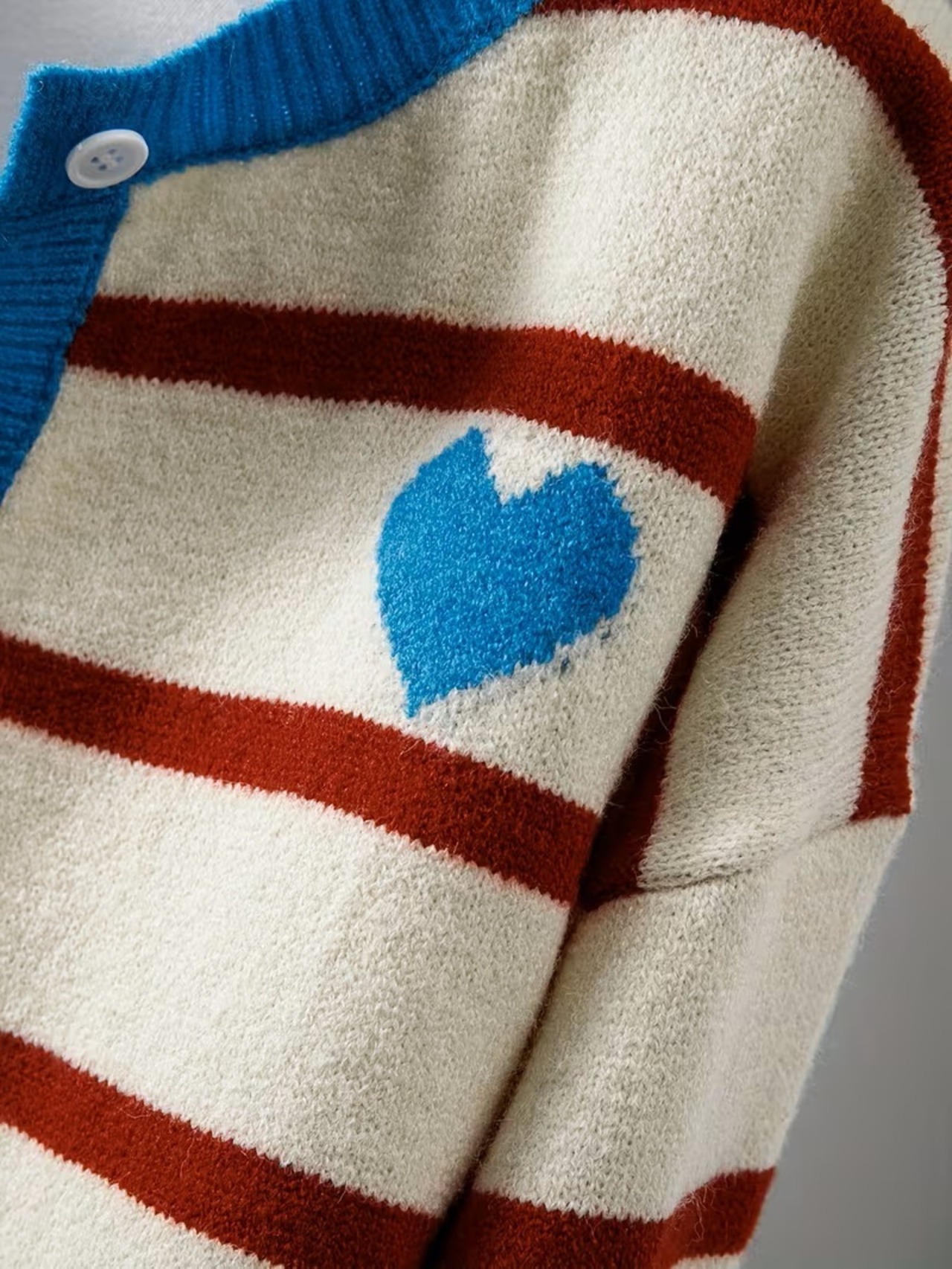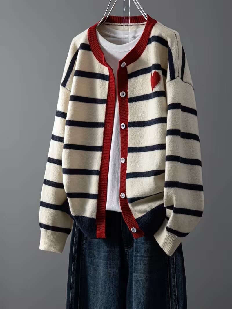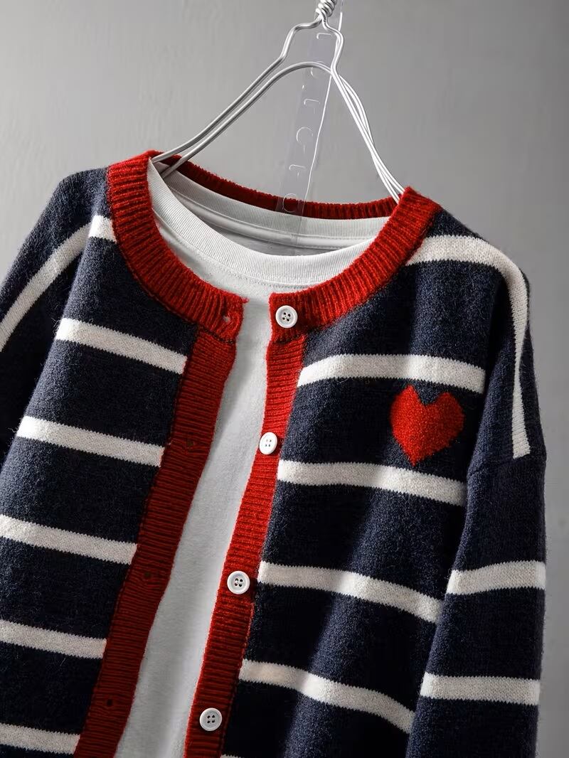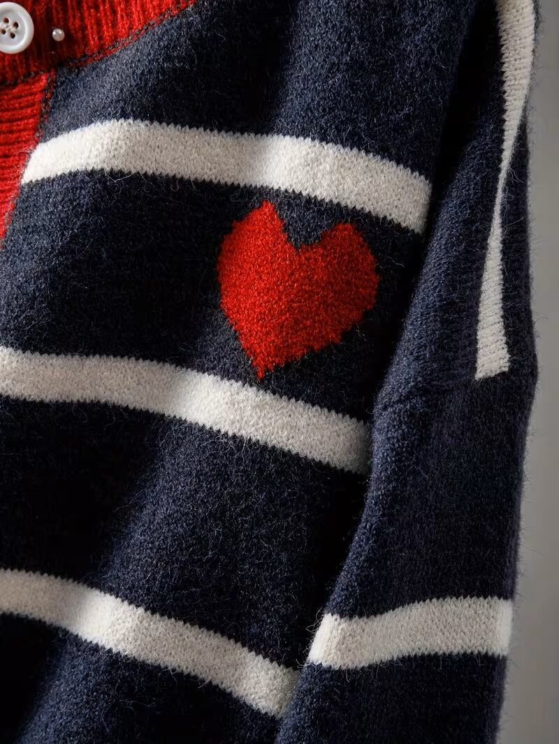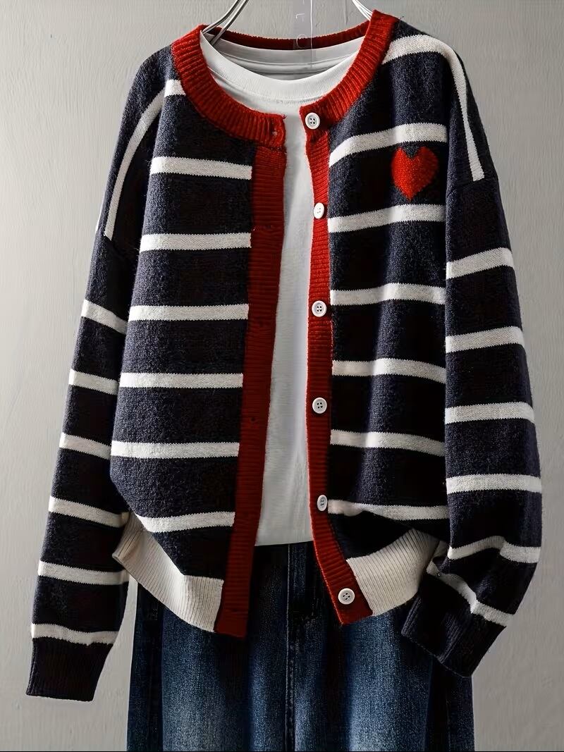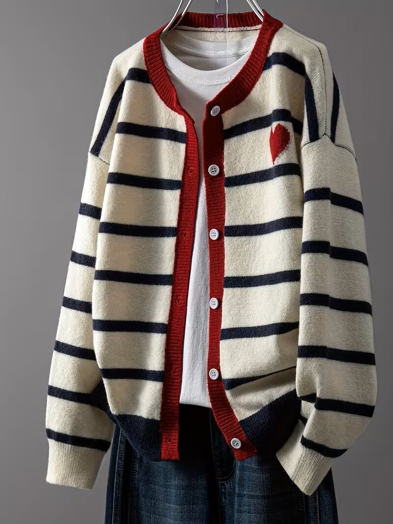 このシーズン、あなたのスタイルを一層引き立てるアイテム、可愛いハート柄のボタンアップストライプセーターが登場しました!バレンタインデーにもぴったりなこのセーターは、柔らかな肌触りと心地よい着心地を実現しており、ファッション性と実用性を兼ね備えています。ストライプデザインがシックさを引き立て、どんなコーディネートにも合わせやすく、デイリーから特別な日まで幅広く活躍します。