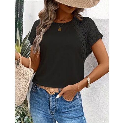 【送料無料】エレガントな女性用の短袖Tシャツ、コントラストのレーストリムが特徴 - ラウンドネック、ソリッドブラック、軽量で通気性が高い、春/夏/秋に最適、カジュアルからフォーマルまでの多用途、シーズンファッション、洗練されたスタイル、軽量な素材 K03200
