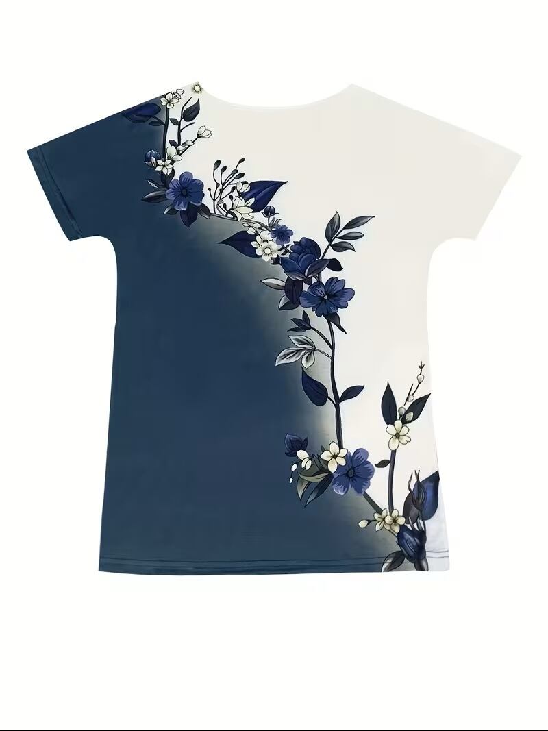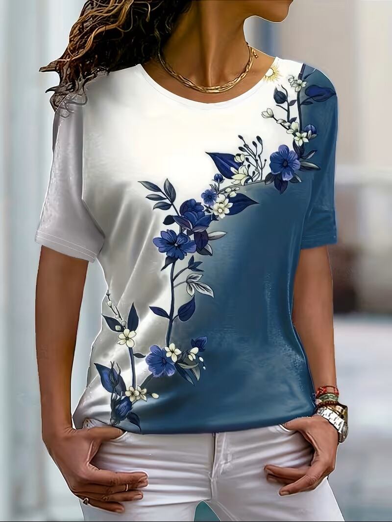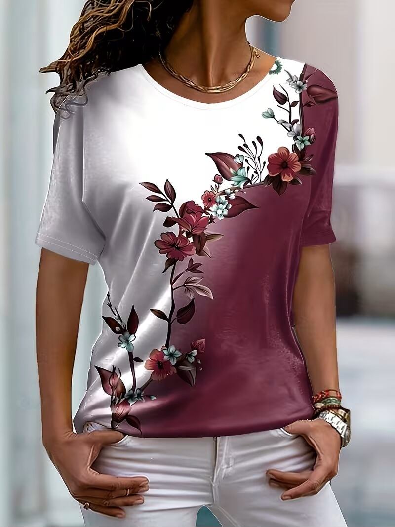 【送料無料】【新作】レディース 花柄 カラーブロック ラウンドネック フィット カジュアル プリント 半袖 Tシャツ 欧米製 K03213