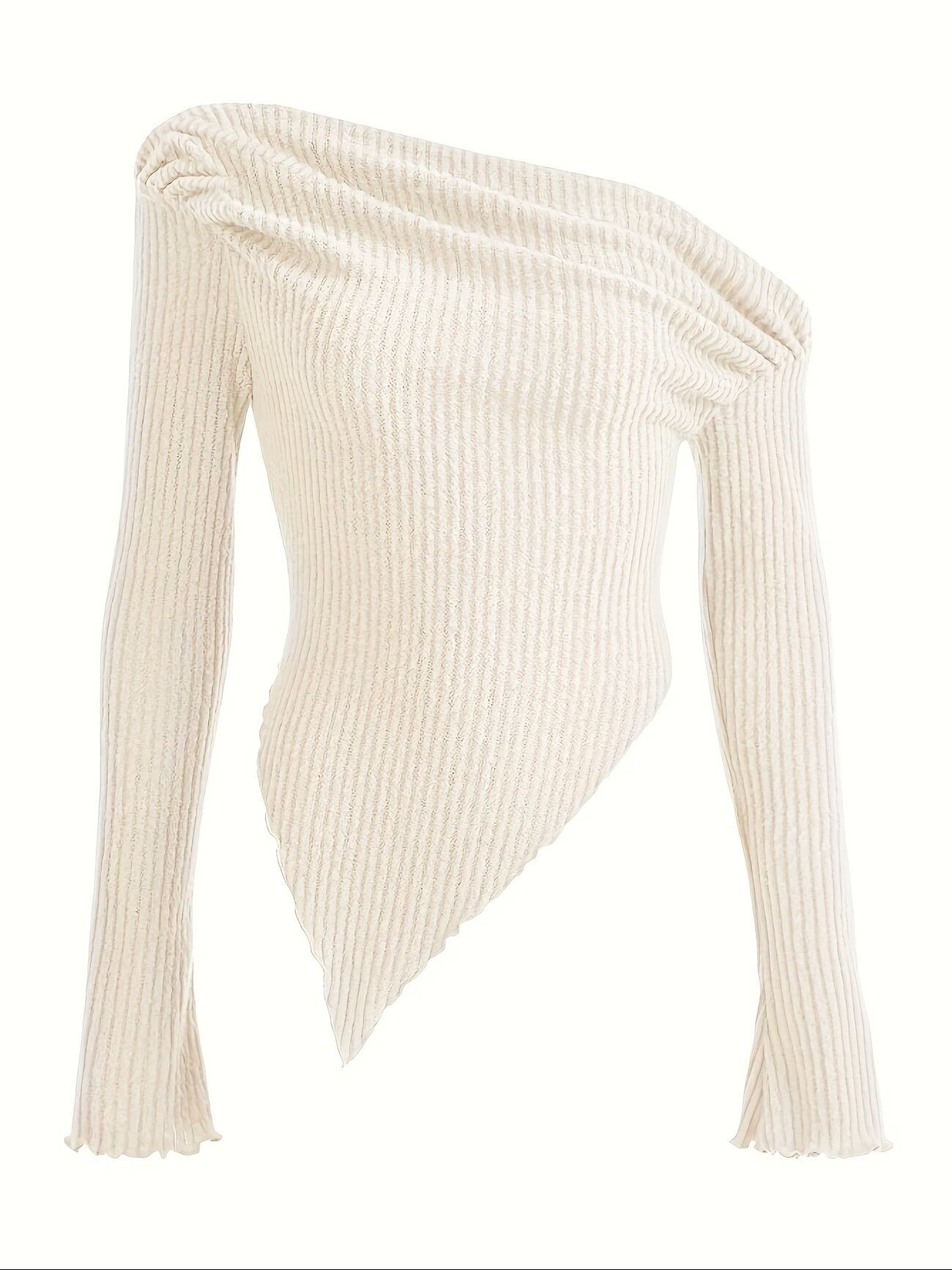 【送料無料】ソリッドシャーリング非対称ネックTシャツ、カジュアルハンカチヘム長袖トップ、春秋用、婦人服 K03235