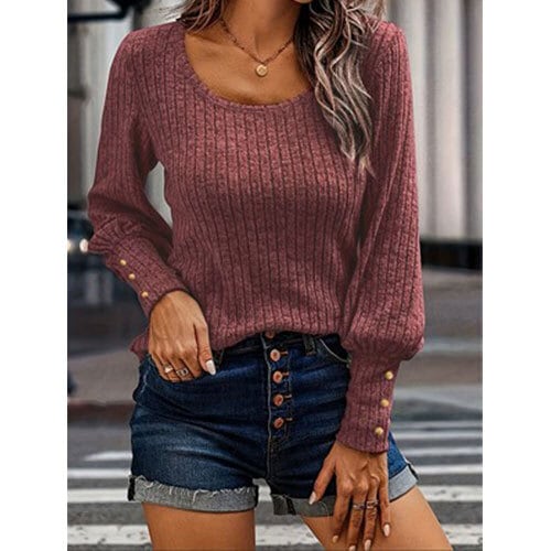 【送料無料】レディース ミネラルレッド リブ編み 長袖トップス ビショップスリーブ - ラウンドネック、中程度のストレッチ、洗濯機可、春秋向け レギュラーフィット、季節感あふれるファッション K03246