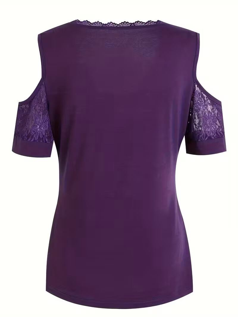 トレンディでエレガントな印象を与える、オフショルダーのコントラストレーススリーブ半袖Tシャツ。ボタンデコレーションが施されたデザインにより、シンプルながらも目を引くアクセントを持っています。軽やかな素材感が心地よく、夏場のカジュアルスタイルにぴったりな一枚です。オフショルダーのシルエットは、女性らしさを引き立てつつも、カジュアルな雰囲気も大切にしています。