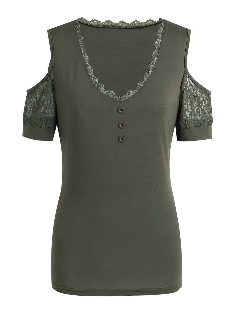 【送料無料】オフショルダー コントラストレーススリーブ ボタンデコレーション トレンディな新作 半袖Tシャツ K03265