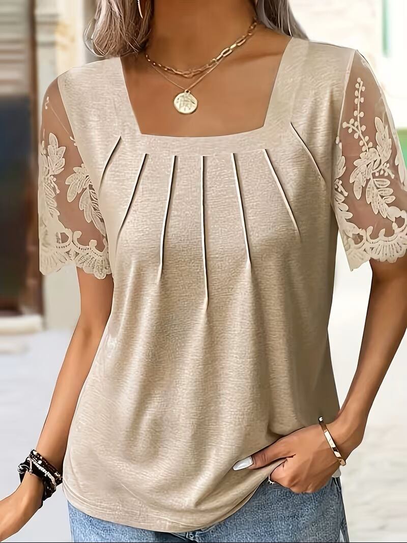 ファッショナブルでエレガントな印象を与える、オーダーメイドのレディース半袖トップス(スクエアネック、レーストリム付き)。このトップスは、スタイリッシュなデザインと快適な着心地を兼ね備えており、特別な日からデイリーユースまで幅広く活躍します。柔らかな生地感と優雅なレーストリムが、女性らしさを引き立て、コーディネートに華やかさをプラスします。