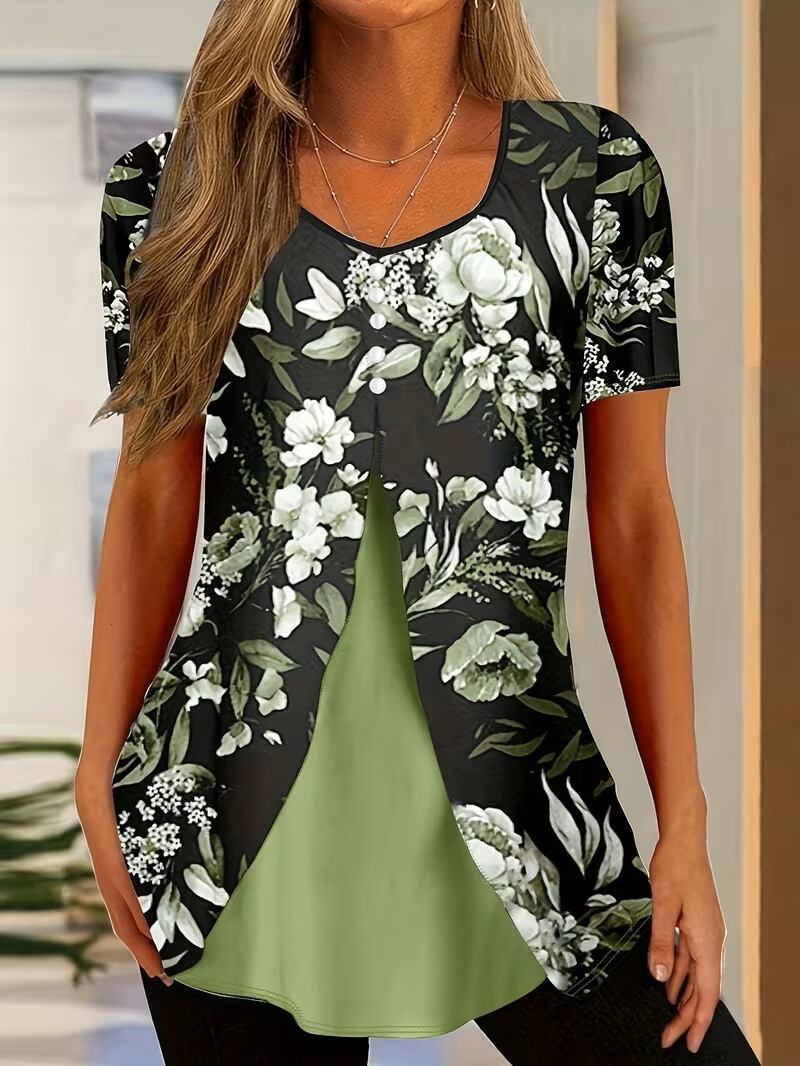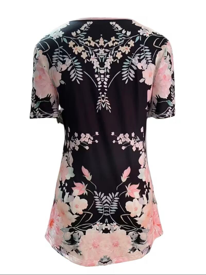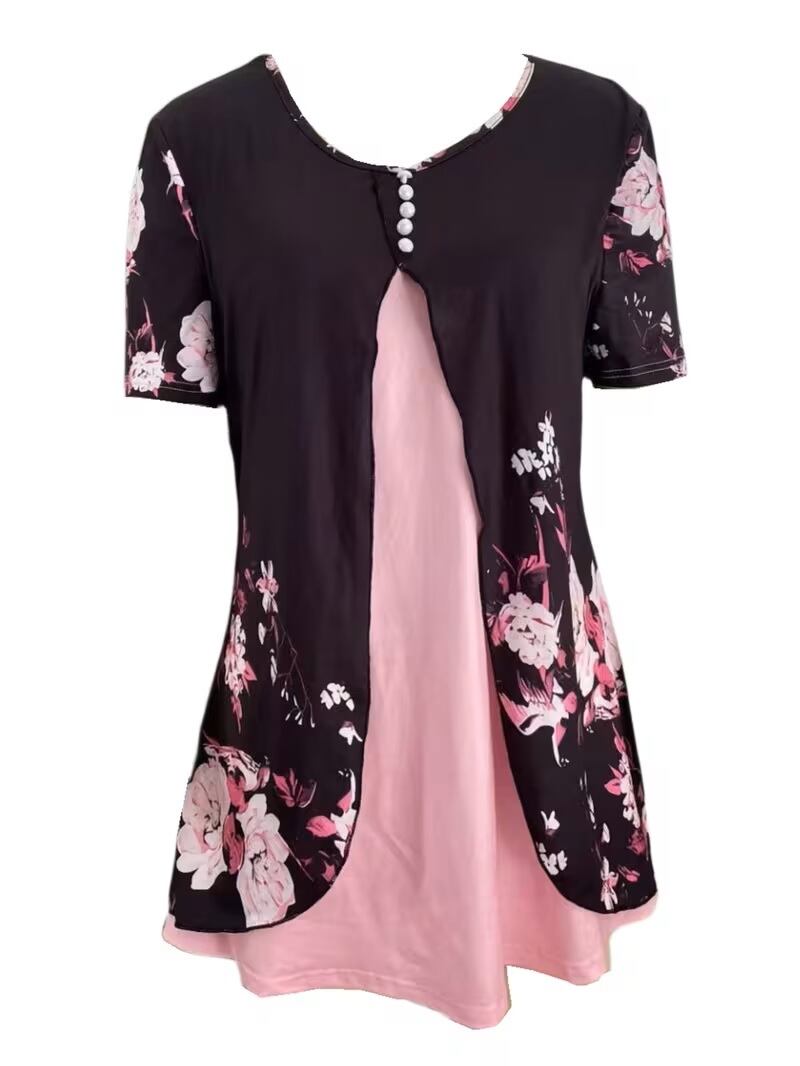【送料無料】花柄フェイクパール装飾 Tシャツ、カジュアル V ネック半袖トップス、春夏用、婦人服 K03274