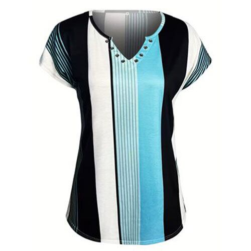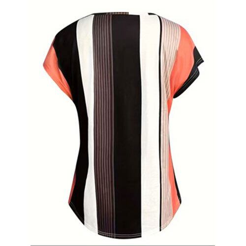 【送料無料】カラーブロックストライププリントVネックTシャツ、春夏のカジュアルショートスリーブトップ、女性の服 K03280