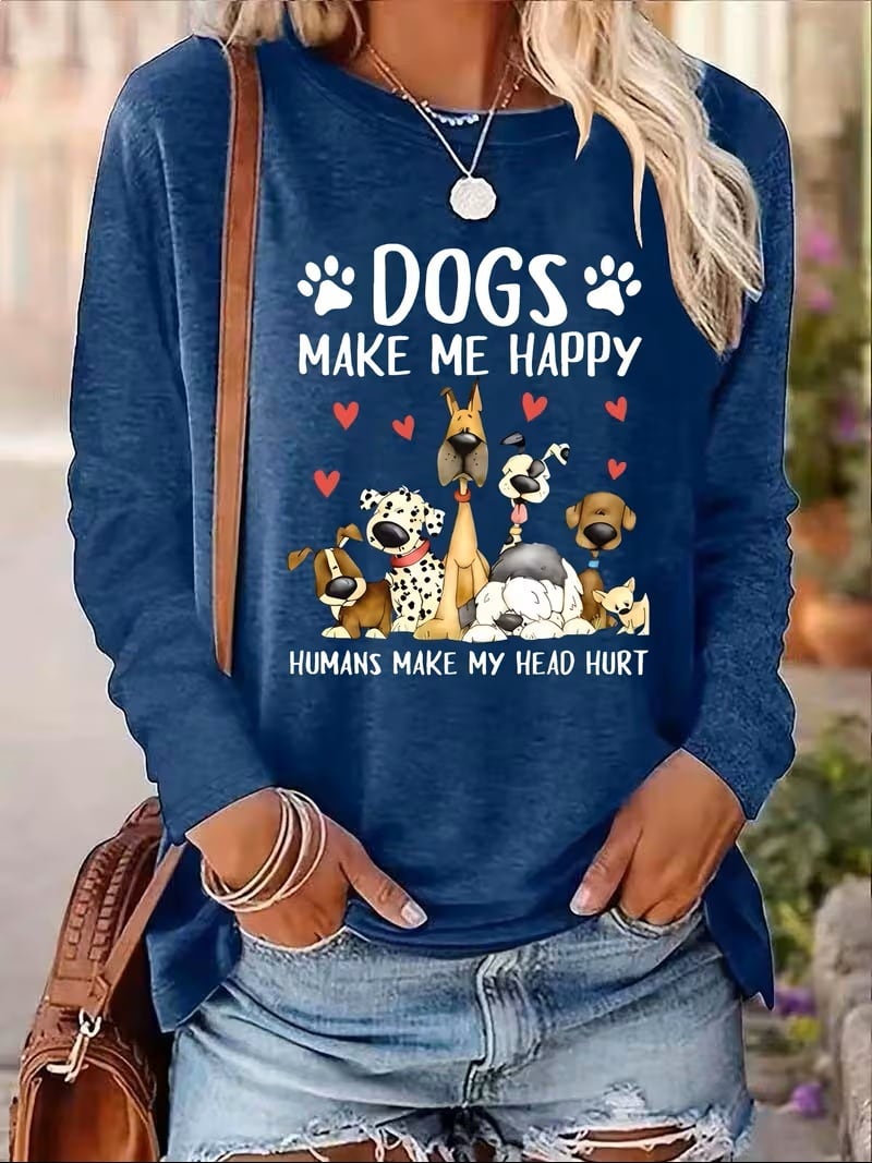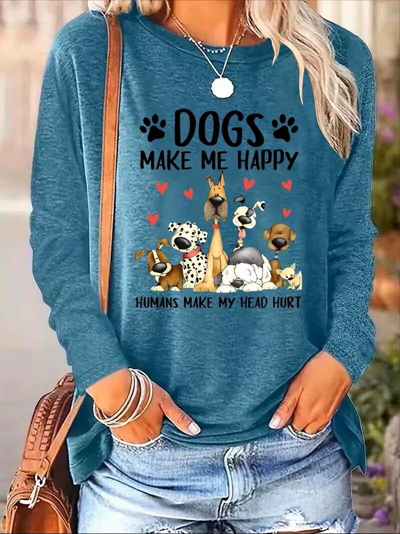 【送料無料】Dog&Letter Print Crew Neck Tシャツ、春と秋のためのカジュアルな長袖トップ、女性の服 K03287